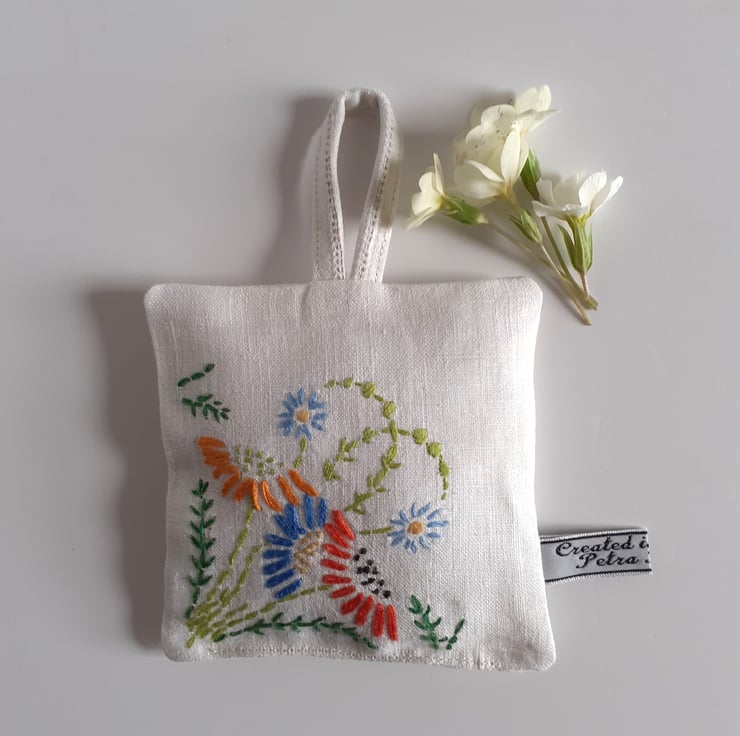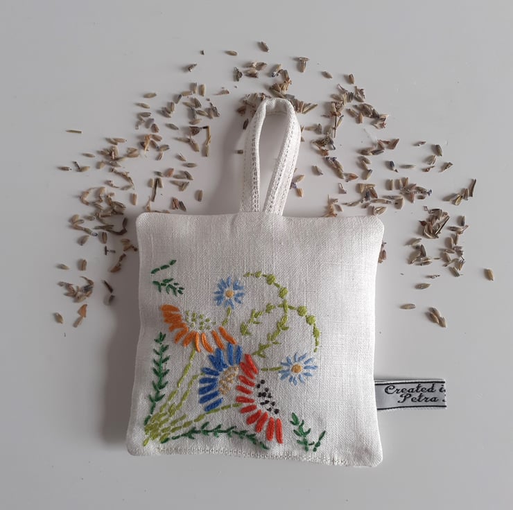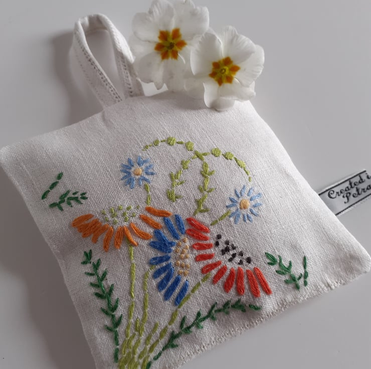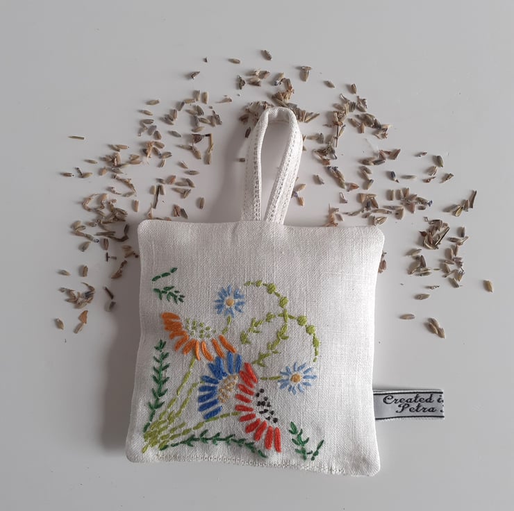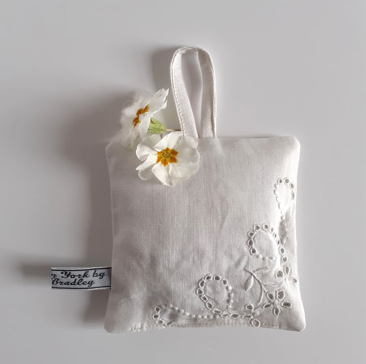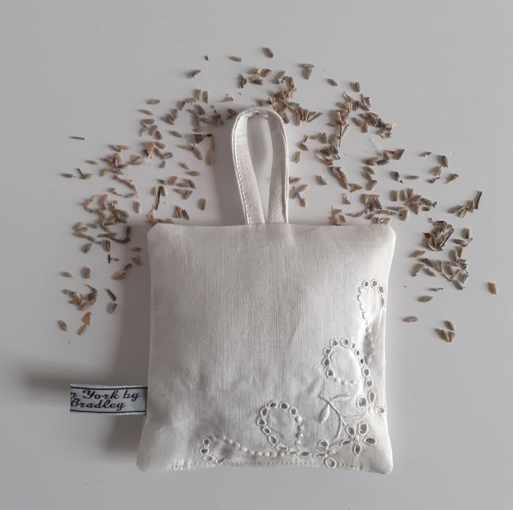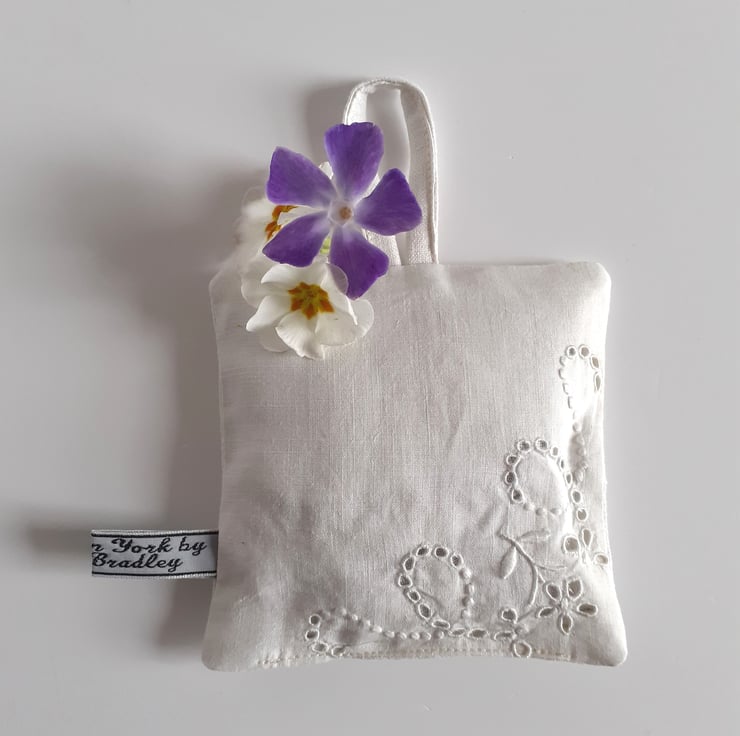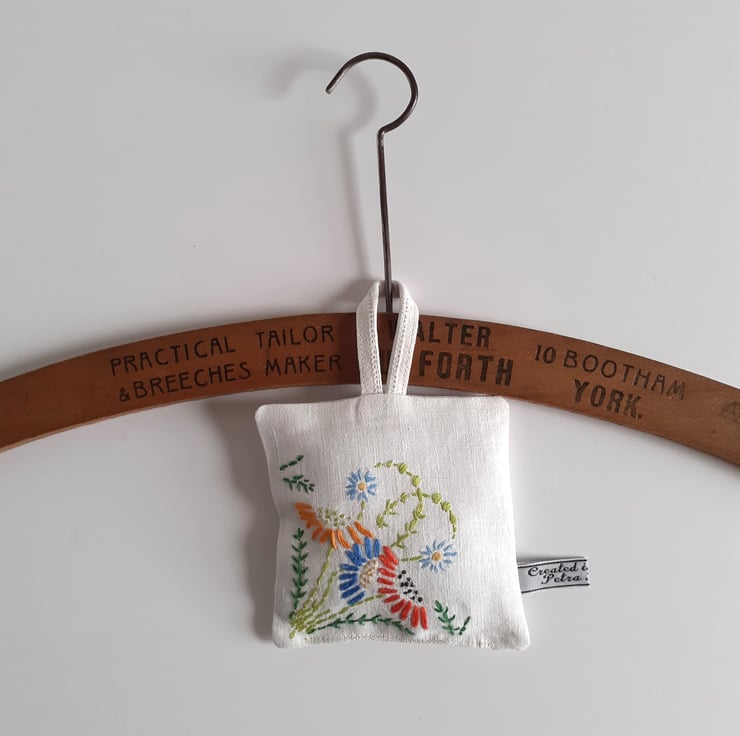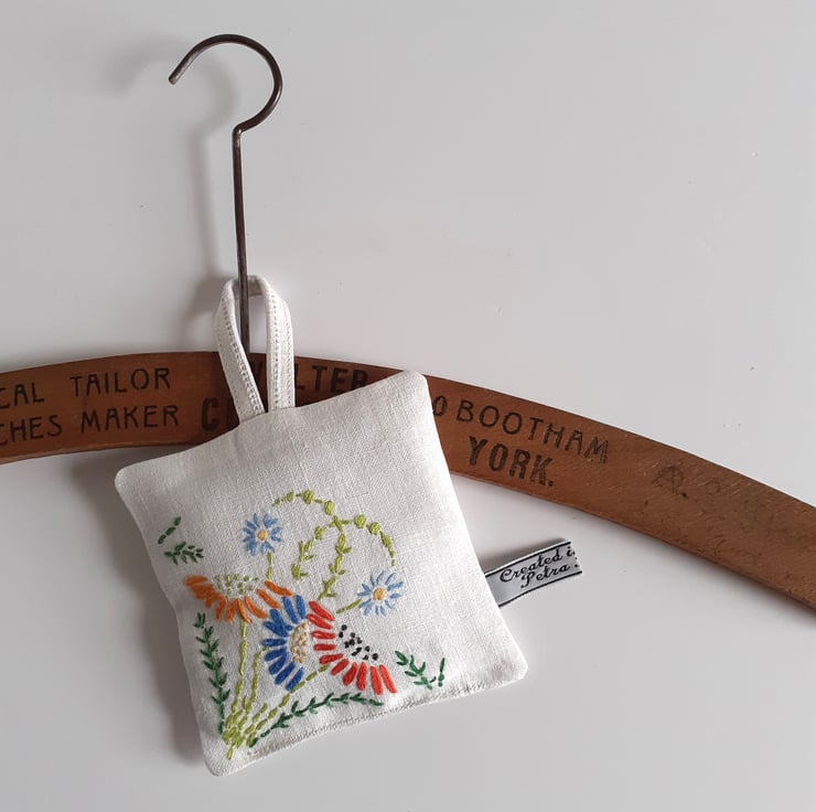 This sweet lavender bag is upcycled from the corner of a vintage embroidered napkin. The front is stitched with a spray of bright flowers, and the back is a tiny section of cream open work embroidery. Inside, is a little muslin bag of lavender from The Wolds in North Yorkshire. Pop it in a drawer or over a hanger to keep your clothes smelling sweet, and to keep at bay those pesky moths. Or, keep it under your pillow to encourage a healthy nights sleep. It would make a lovely house warming gift or a Mothers Day present.