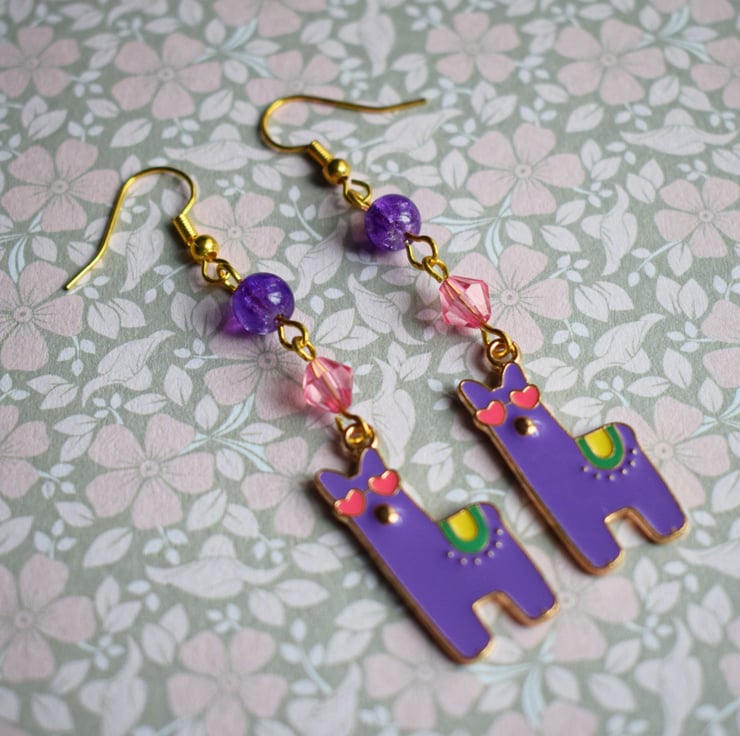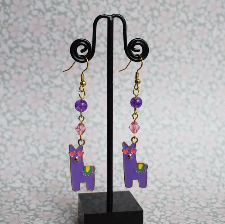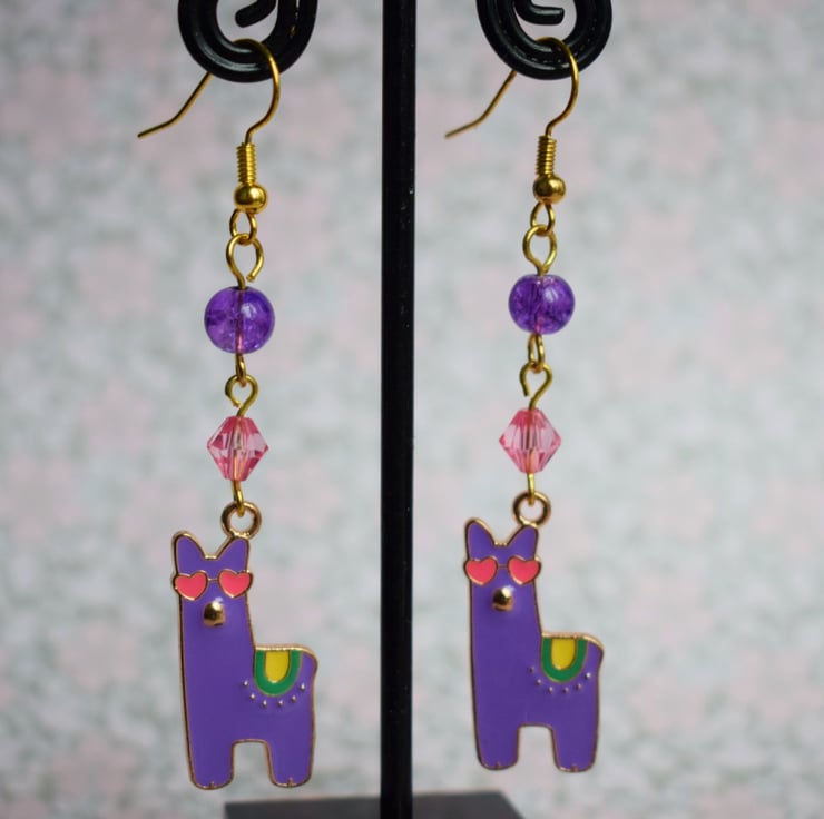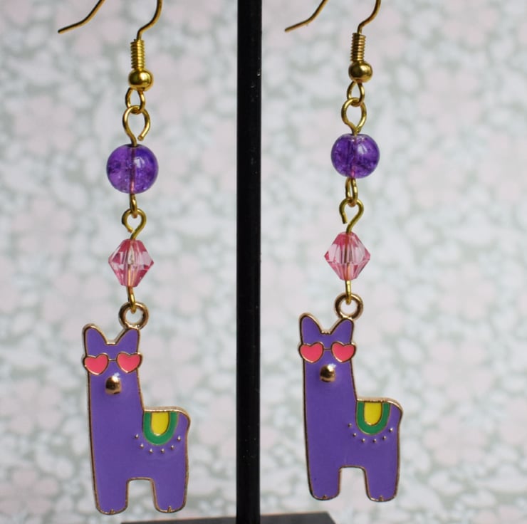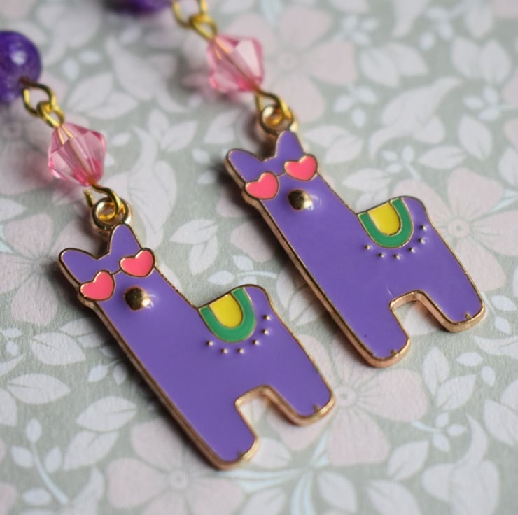 The lilac llamas with pink heart shaped eyes hang below pink acrylic and purple glass beads. The earwires are goldplated but you can also choose to swap these for clip on fittings if you don't have pierced ears.