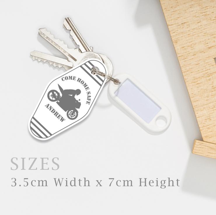 Stylish keyring featuring a sleek motorbike silhouette, complemented by the heartfelt message "Come home safe." Personalise it with a name to add a thoughtful touch.