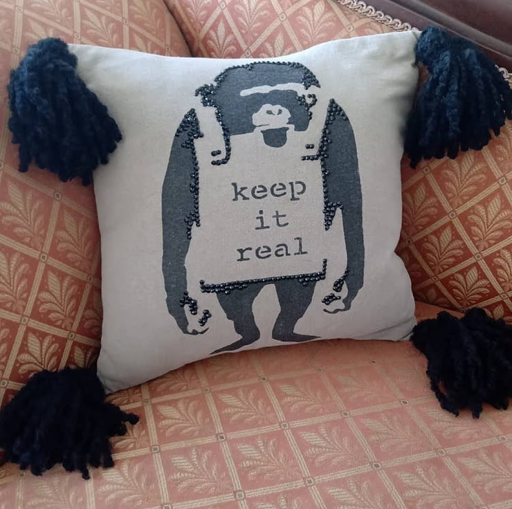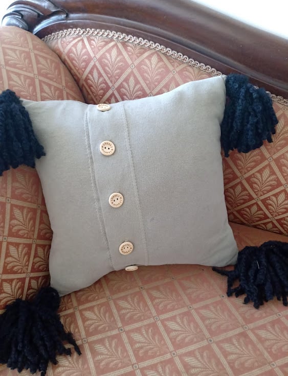 Funky pillow for any room. Decorated with black gems, wood buttons and tassels.