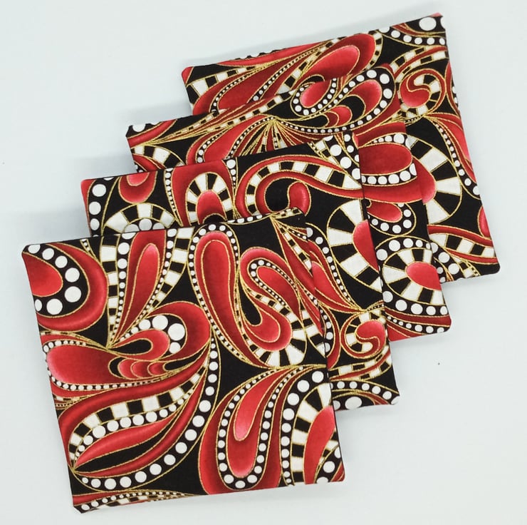 This set of 4 coasters measures 13cm x 13cm and is black cotton on the other side.