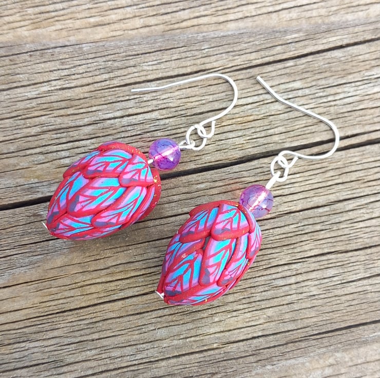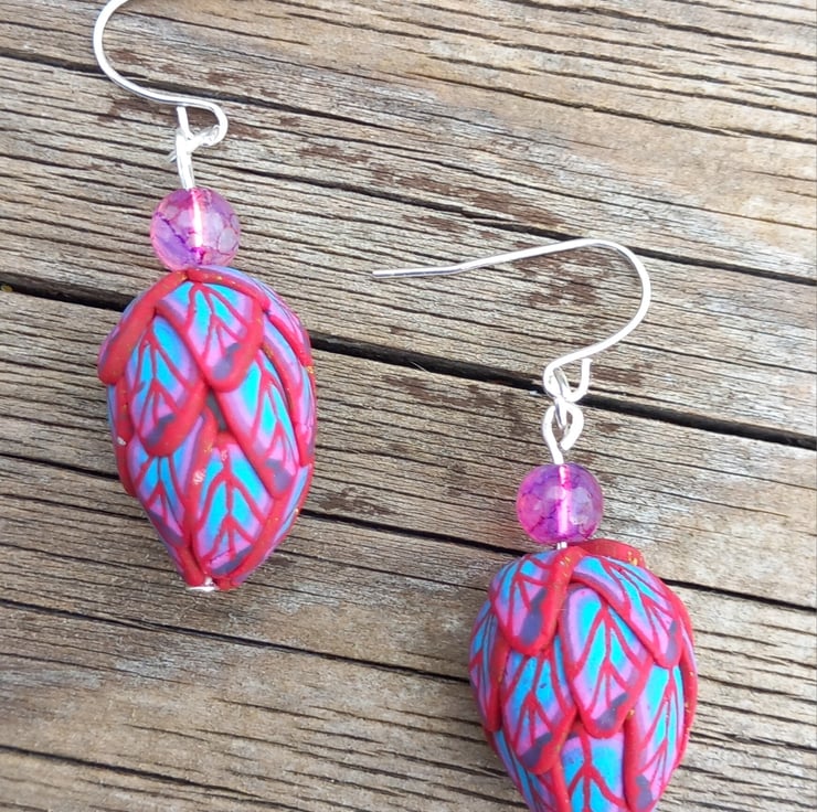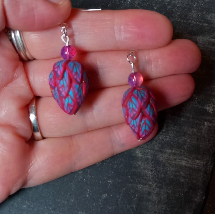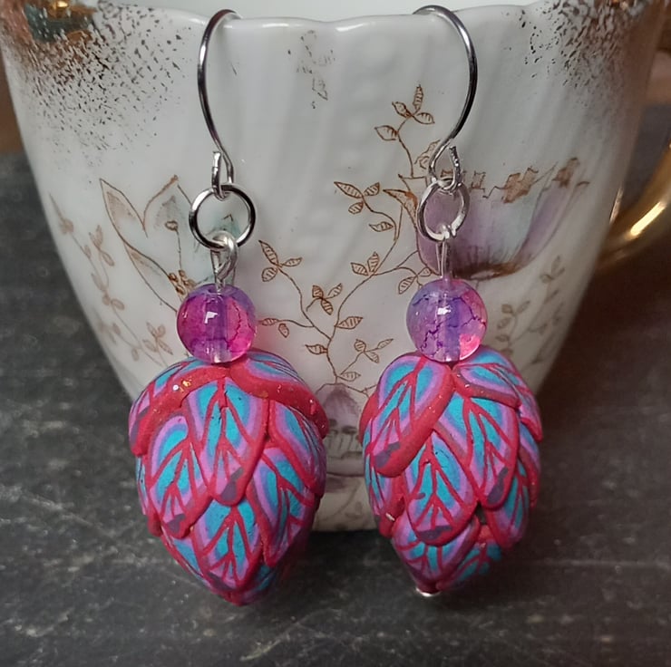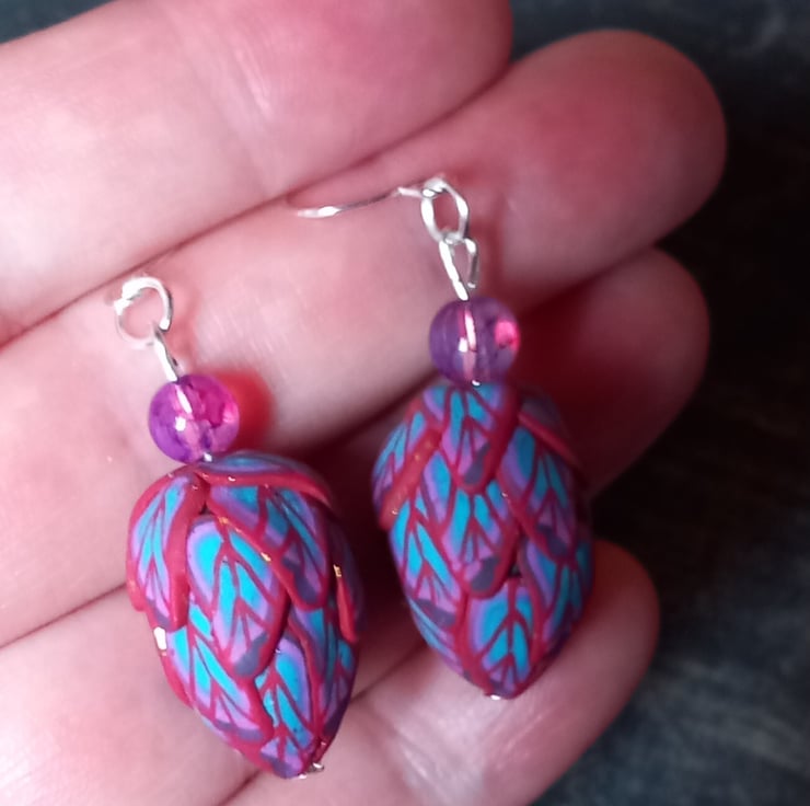 Pretty little pod earrings made with a magenta and blue leaf cane and a lilac and purple stone bead.