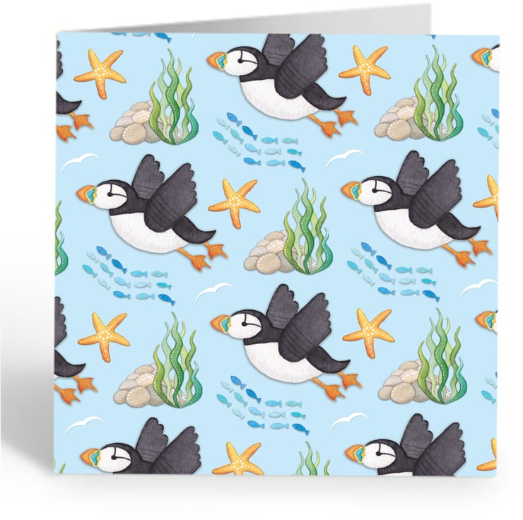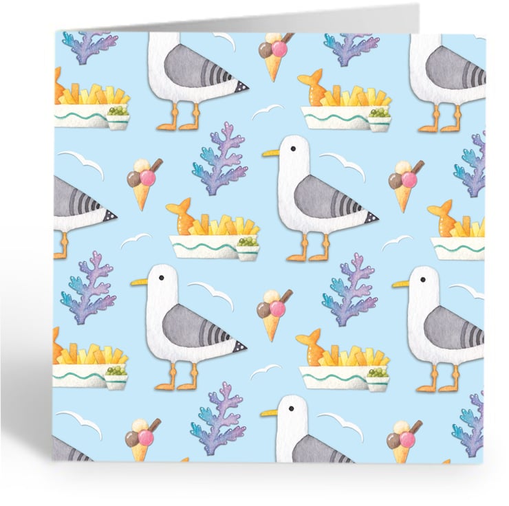 These greetings cards feature cute and colourful patterns created using my original watercolour paintings. Inspired by the East Neuk of Fife in Scotland, one card shows a mischievous seagull, eagerly eyeing some fish and chips, a tiny ice cream cone and some purple seaweed. The other has some rather clumsy looking puffins on the hunt for some tasty sand eels. My whimsical illustrations capture the fun and vibrancy of the Scottish seaside, it's coastal charm and lovable wildlife.