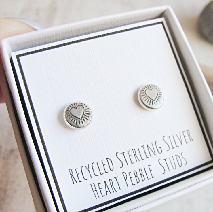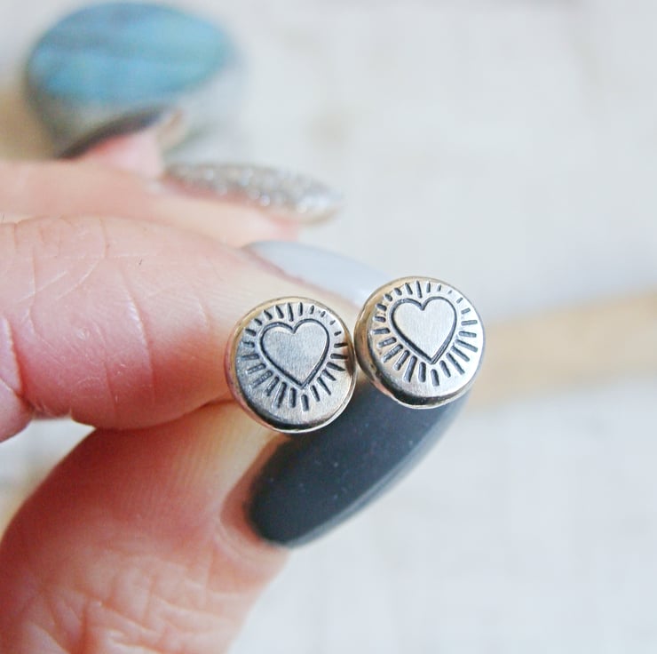 Little chunks of molten silver hammered into these organic pebbles and hand stamped with a beautiful heart burst design.