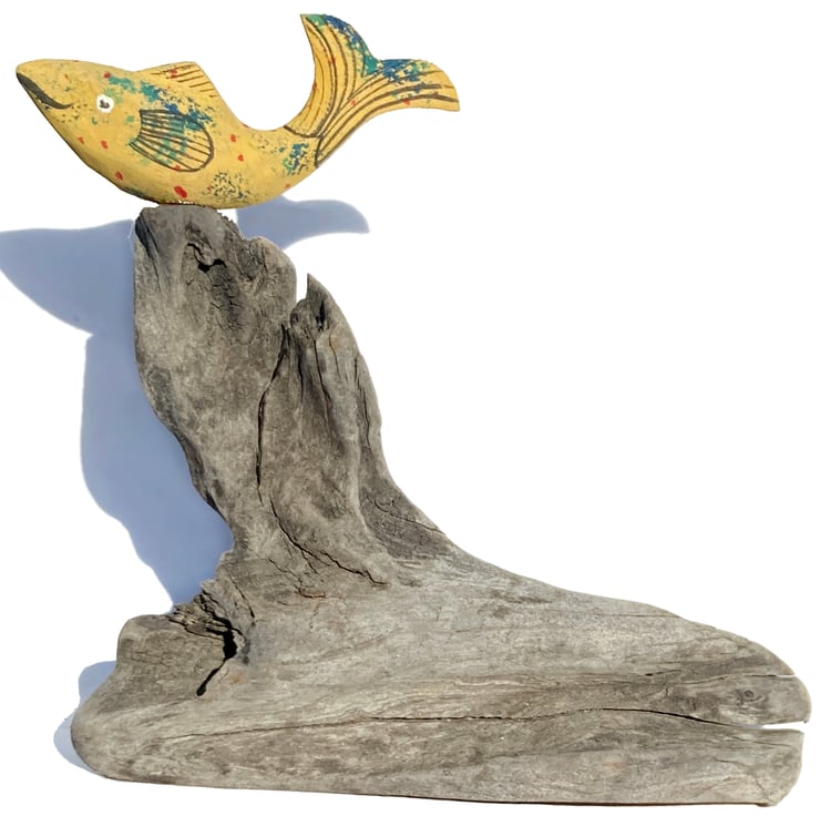 A hand-carved fish and wooden driftwood ornament, handmade by Susan Evans. This beautiful piece of driftwood is all the way from New Zealand. The sculpture measures 15.5cm high, 15cm long and 4cm deep. The ornament is hand-painted and hand-carved and would make a wonderful gift or look perfect in a coastal themed bathroom! (Item: 2597)