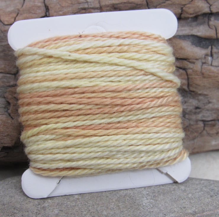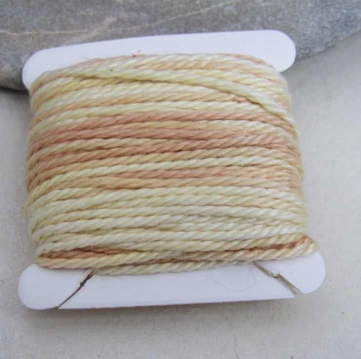 Hand dyed, spacedyed pure cotton DMC 3 embroidery thread, dyed with natural onion and weld dyes to give a delicate yellow - brown ombre thread.