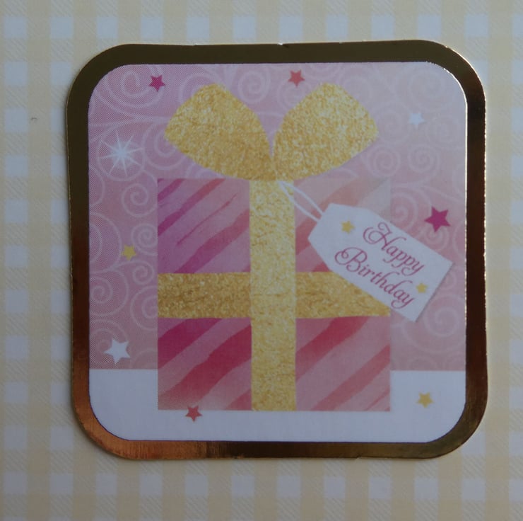 A printed image of a birthday present in shades of red, pink, gold and yellow, edged with gold metallic foil has been mounted centrally on a lemon and cream gingham card background.