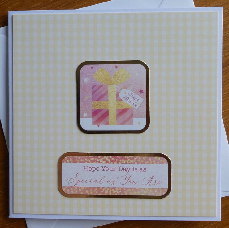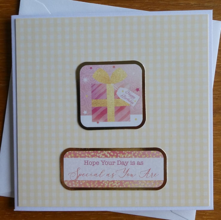 This sweet little birthday card with an image of a pink and yellow gift wrapped parcel and the messages Happy Birthday & Hope Your Day is as Special as You Are would be great to send to family or friends.