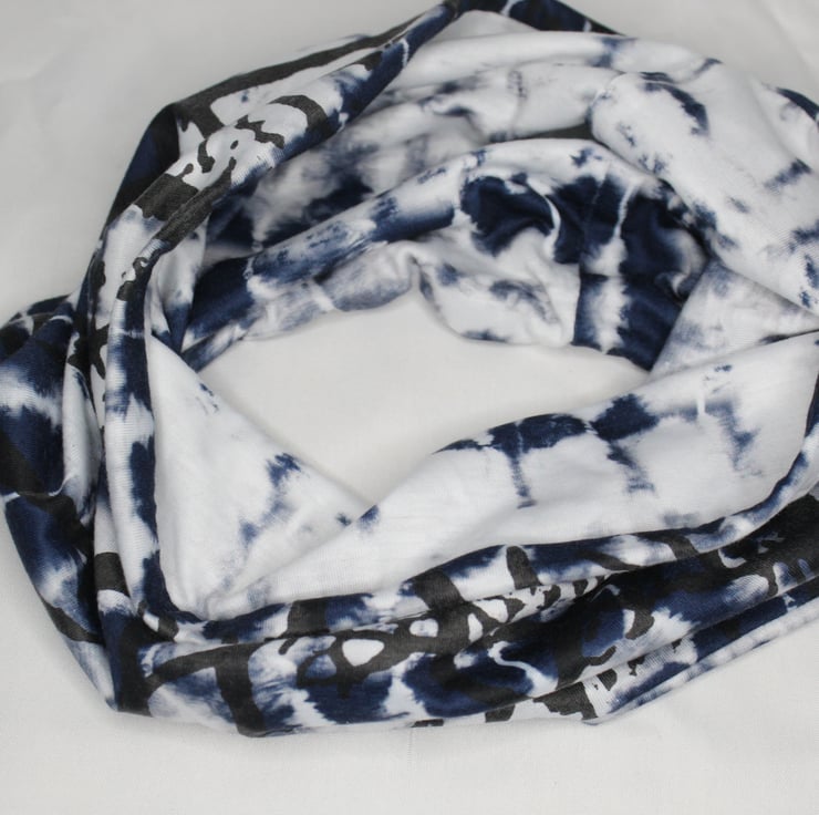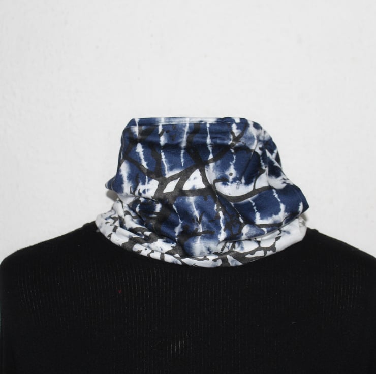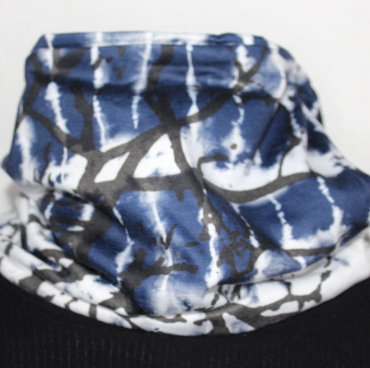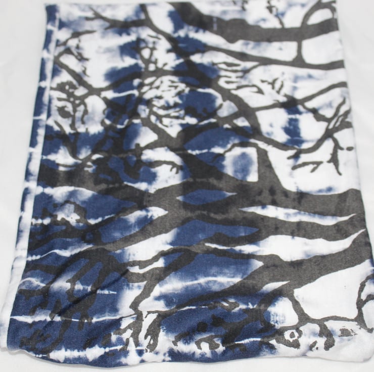 A blue tie dye scarf with black hand-printed tree silhouette, a unique snood infinity scarf.