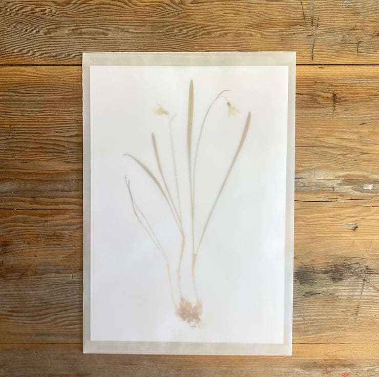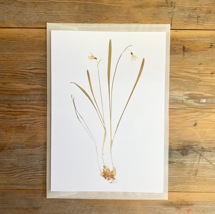 This print features a reproduction of an original pressed flower artwork, annotated on the reverse with the name and meaning of the flower.