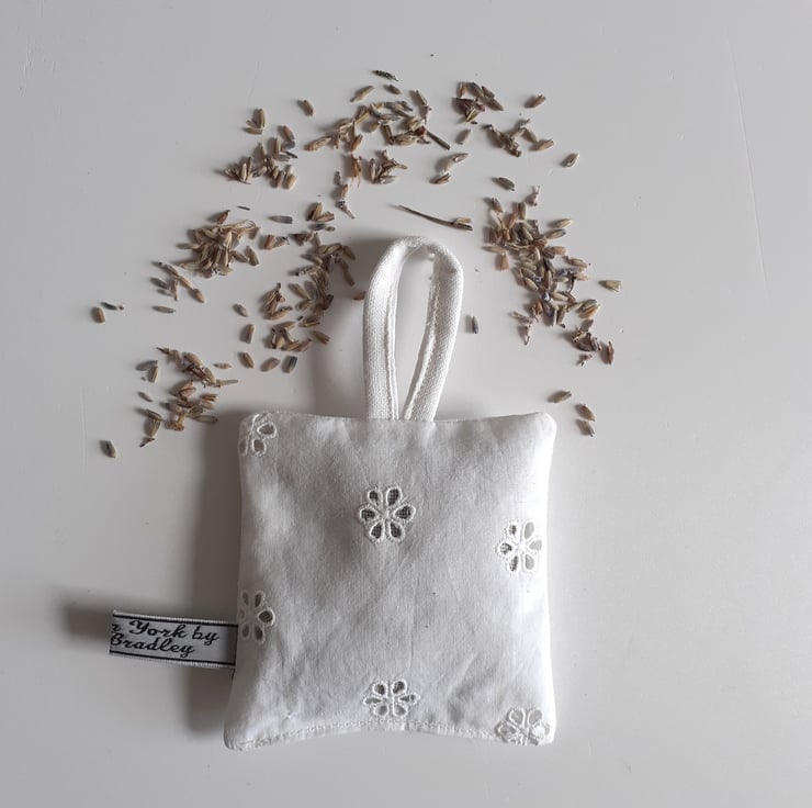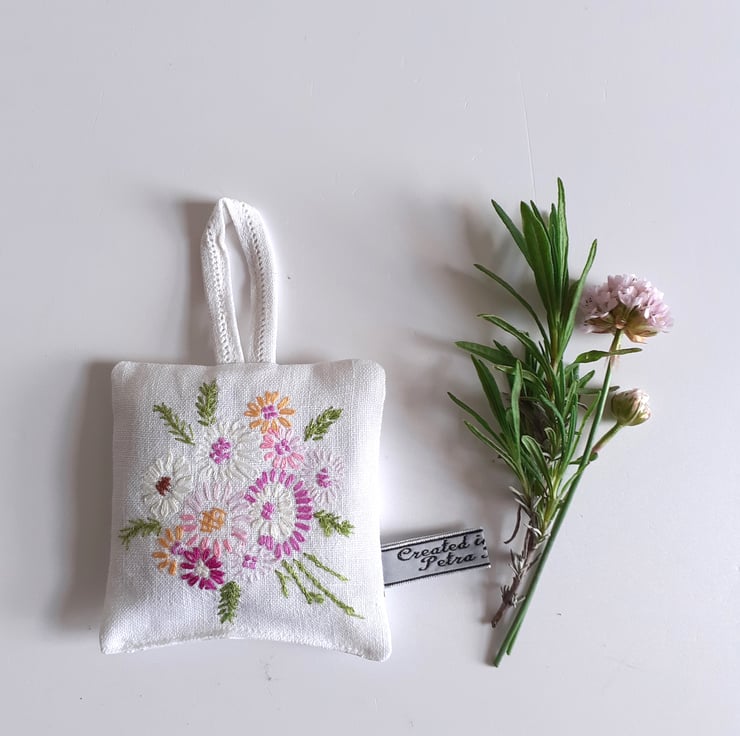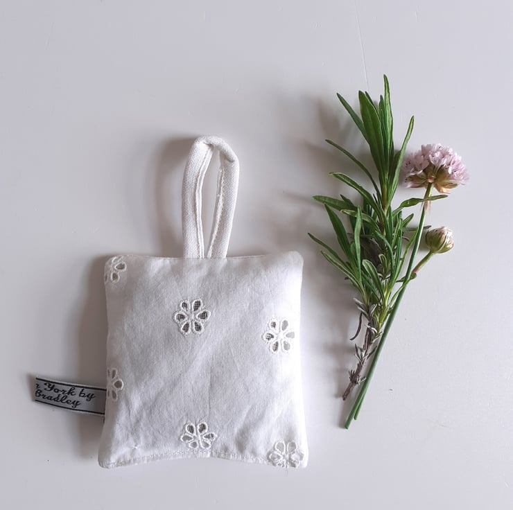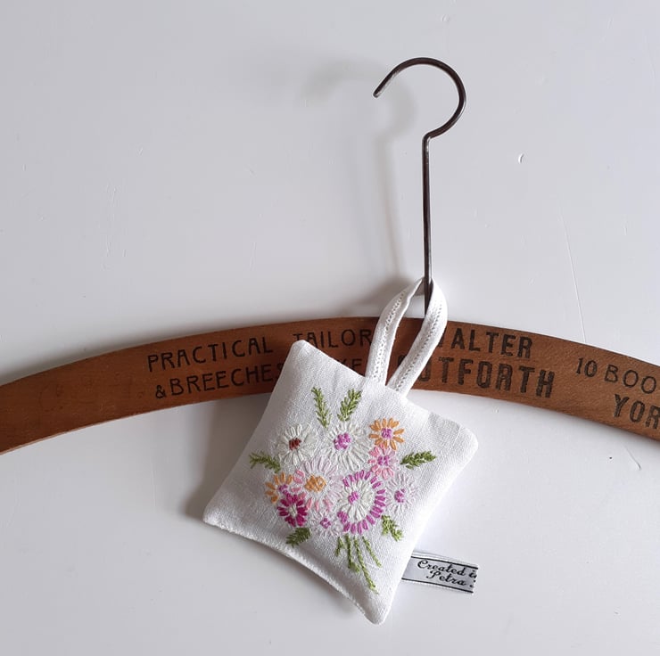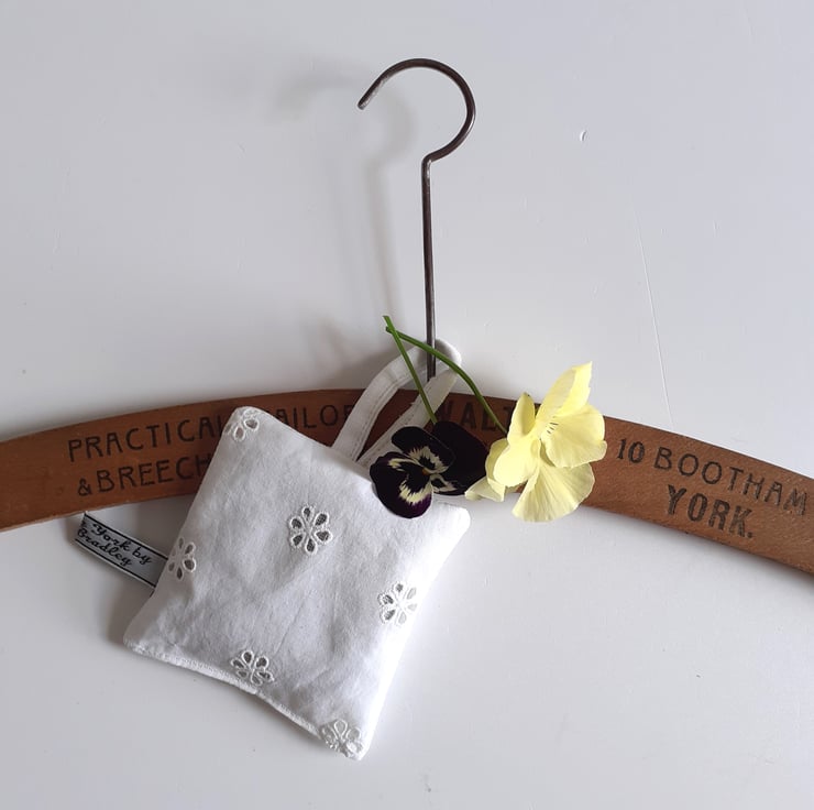 This pretty little lavender bag is upcycled from a corner of a tablecloth which had seen better days. I love the softly faded pinks of its spray of embroidered flowers. Inside is a small muslin bag of lavender from The Wolds in North Yorkshire. Lavender has been known for centuries for its special powers! Pop it in a drawer or over a hanger to keep your clothes smelling sweet, or under your pillow to encourage a healthy nights sleep. Storing it with your clothes will also help to keep at bay those pesky moths. This little lavender bag would make a nice house warming gift or a lovely little present for Mum.
