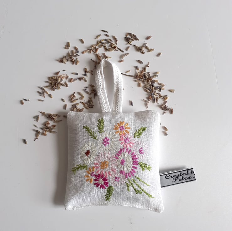 The front is embroidered with a spray of flowers, whilst the back is white broiderie anglaise, to let out the scent.