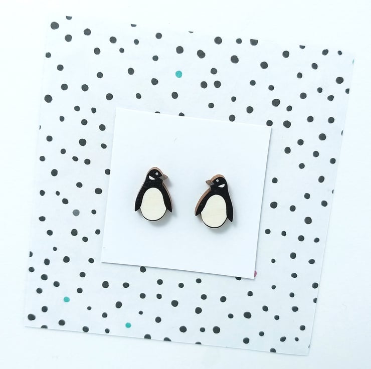 Wooden penguin stud earrings, designed by Carolyn and made in the UK using birch plywood from sustainable, responsibly managed woodlands.