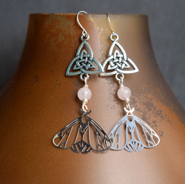 Beautiful moth earrings with rose quartz beads and triquetra connectors, perfect for those who love the more spiritual side of life.