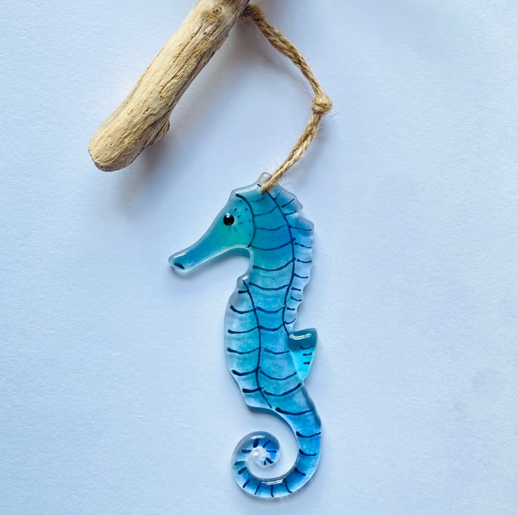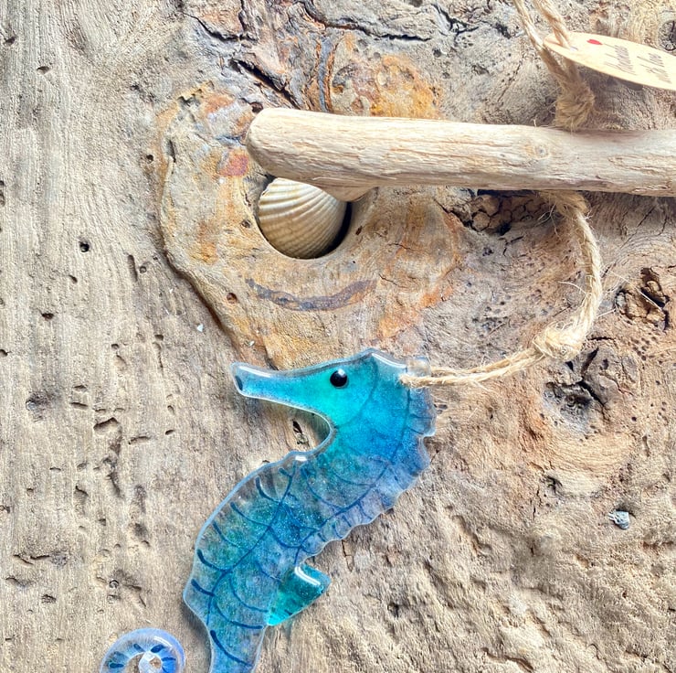 Fused glass Blue seahorse decoration sun catcher hanging from driftwood .