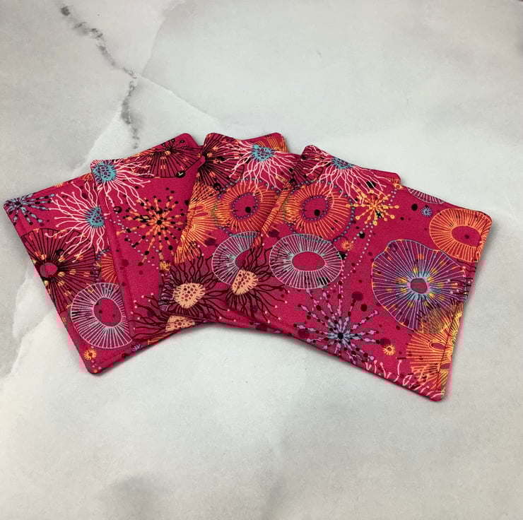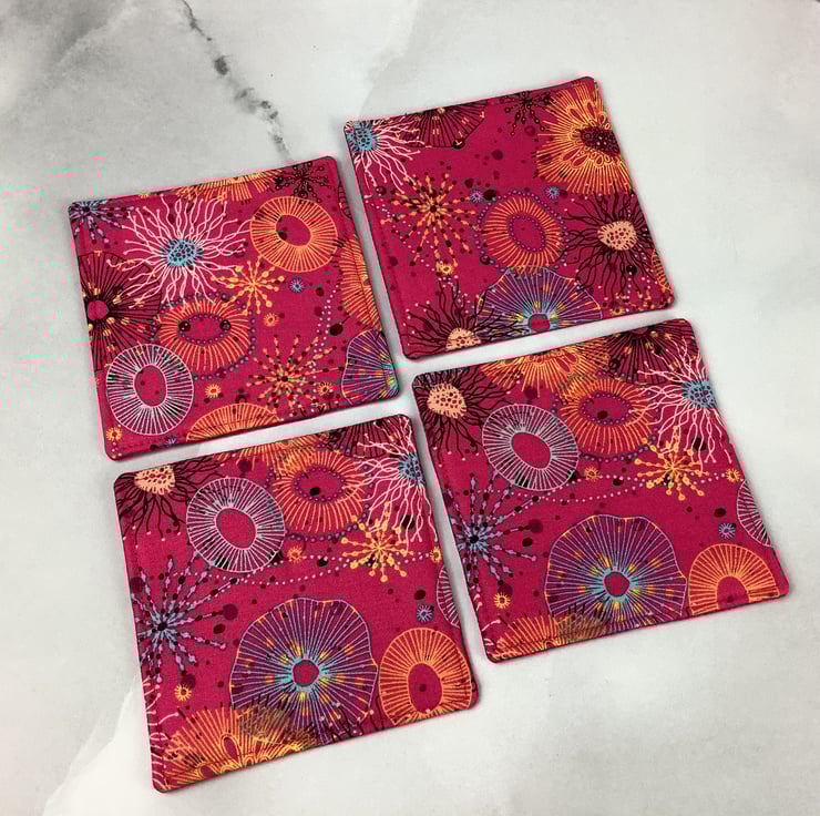 Handmade fabric coaster set in a choice of fun brightly coloured sea creatures themed cotton fabrics, lined in complimentary cottons.