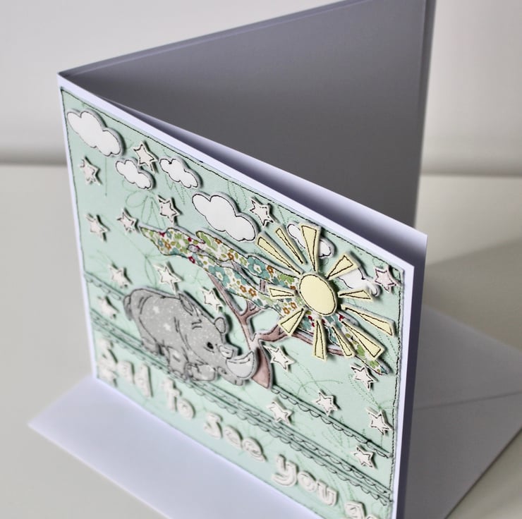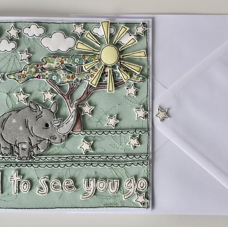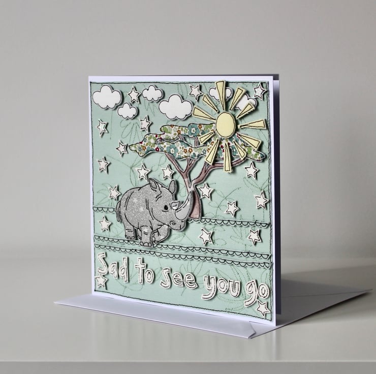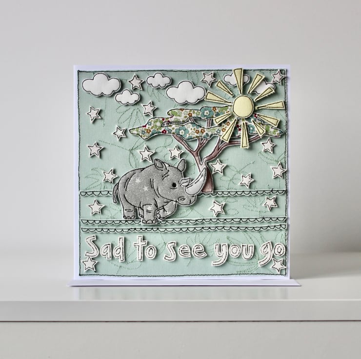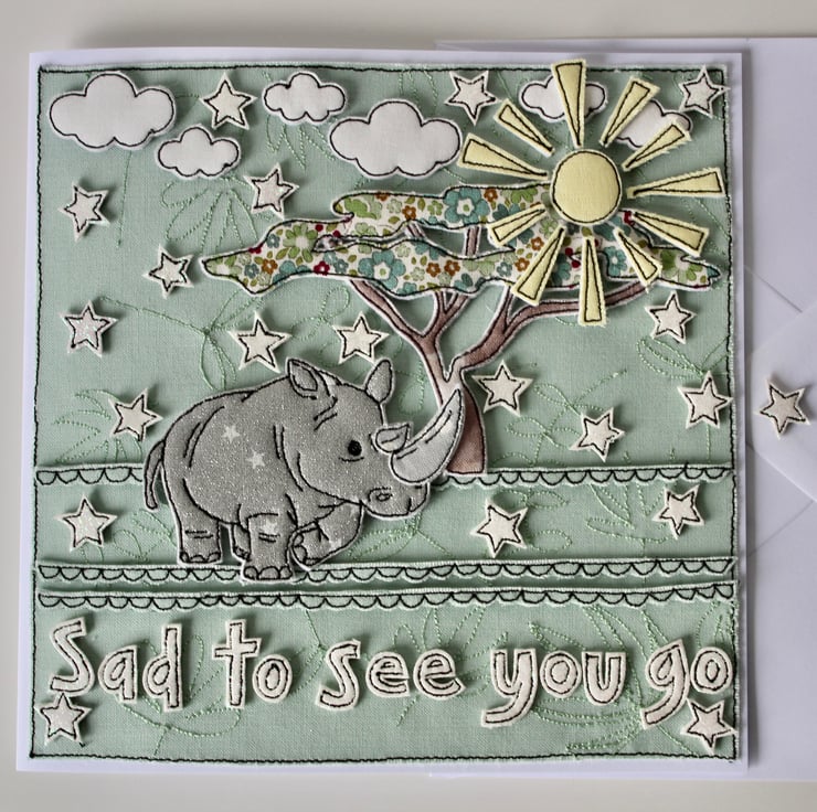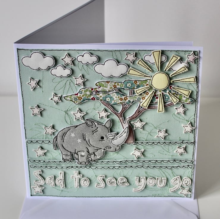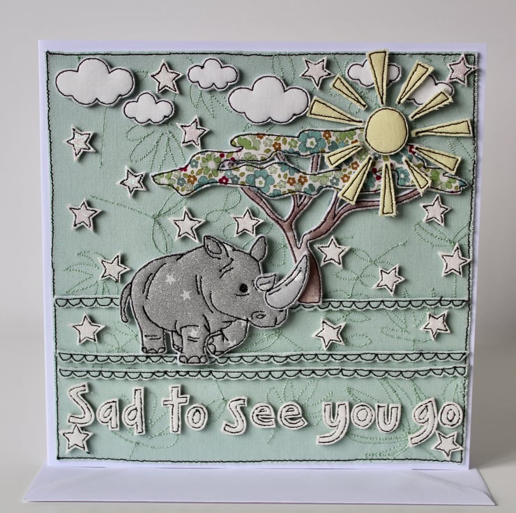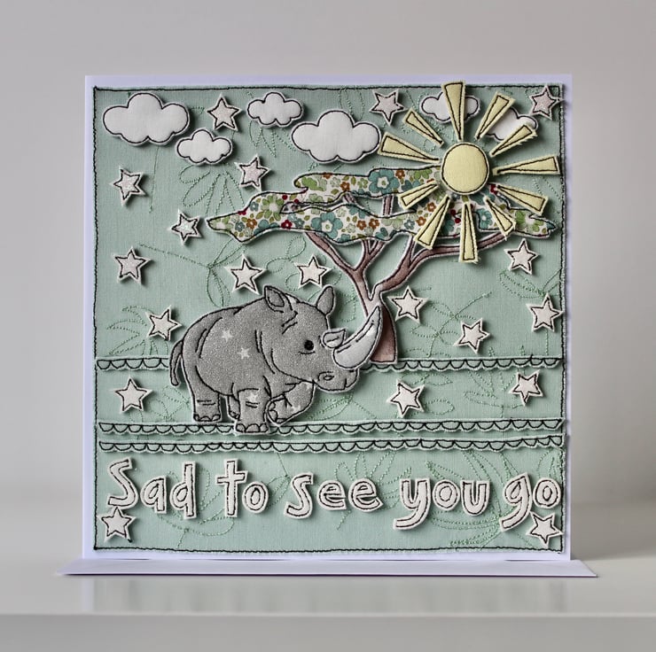 A handmade card which includes a rhino and the sewn words 'Sad to see you go'.