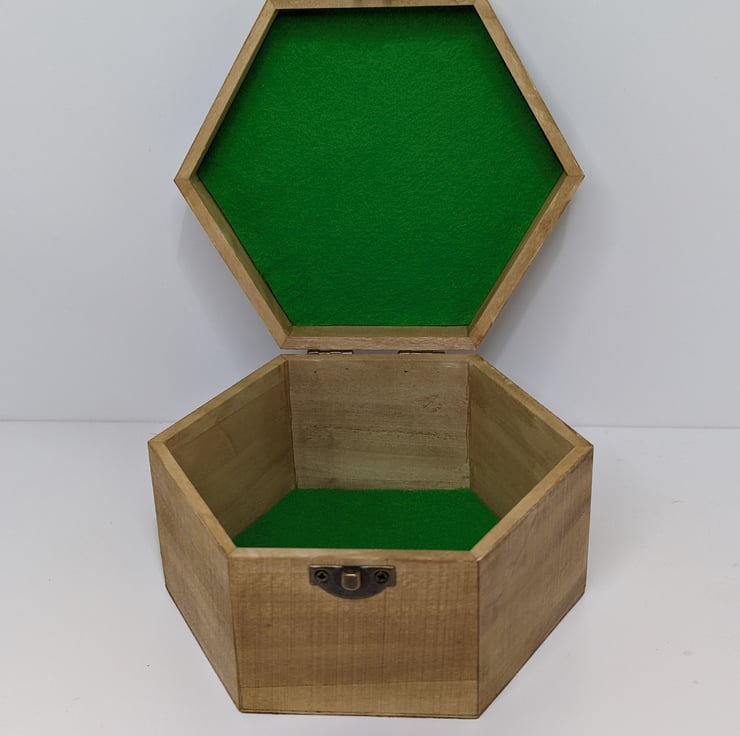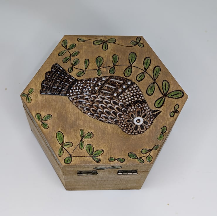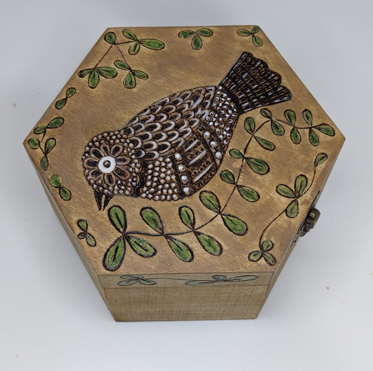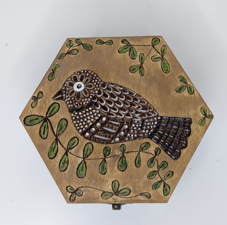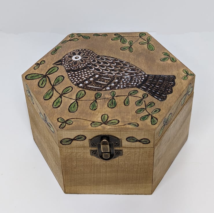 Decorative hexagonal wooden box with metal clasp which has been lovingly hand burnt, using the art of pyrography, with my songbird and leaves design and coloured with acrylic paints and light oak stain and finished with varnish. The interior of this decorative box has been part-lined with green felt.