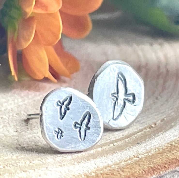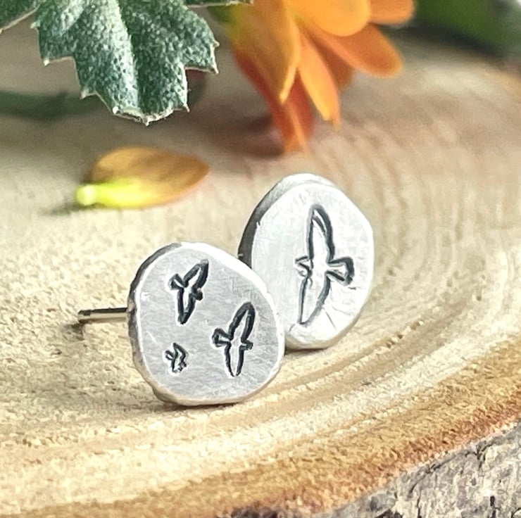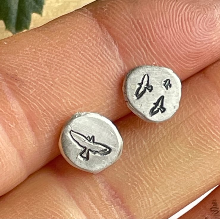 Perfect for everyday wear these cute little mid matched studs are made from recycled silver. They have a bird pattern stamped into the surface and I’ve oxidised them to make the pattern stand out.