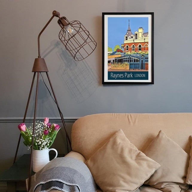 A travel poster print of Raynes Park, and the view of the Raynes Park Tavern and the station, from my own original acrylic painting.