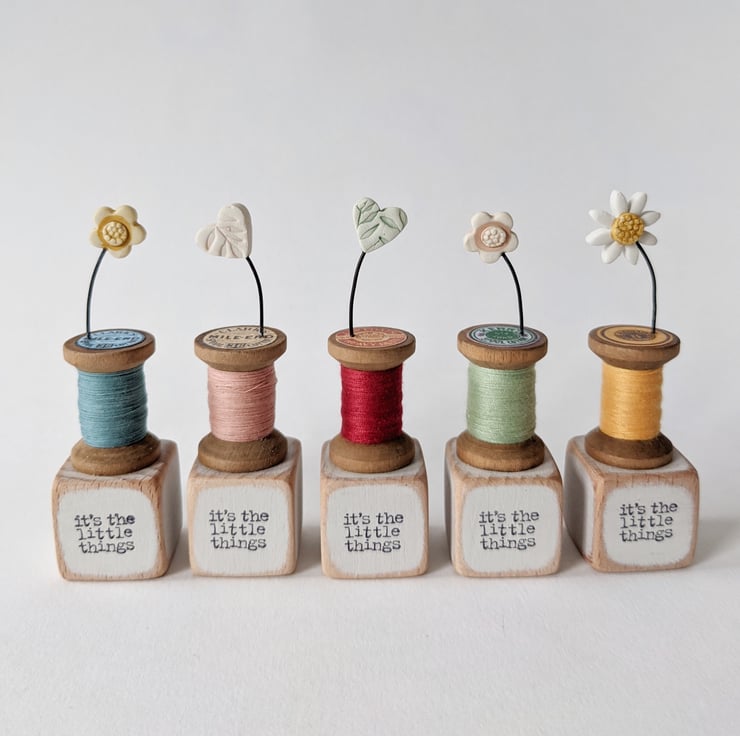 I love these teeny wooden bobbins! The tiny daisy is perfect on top.