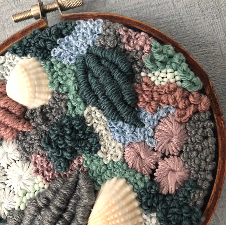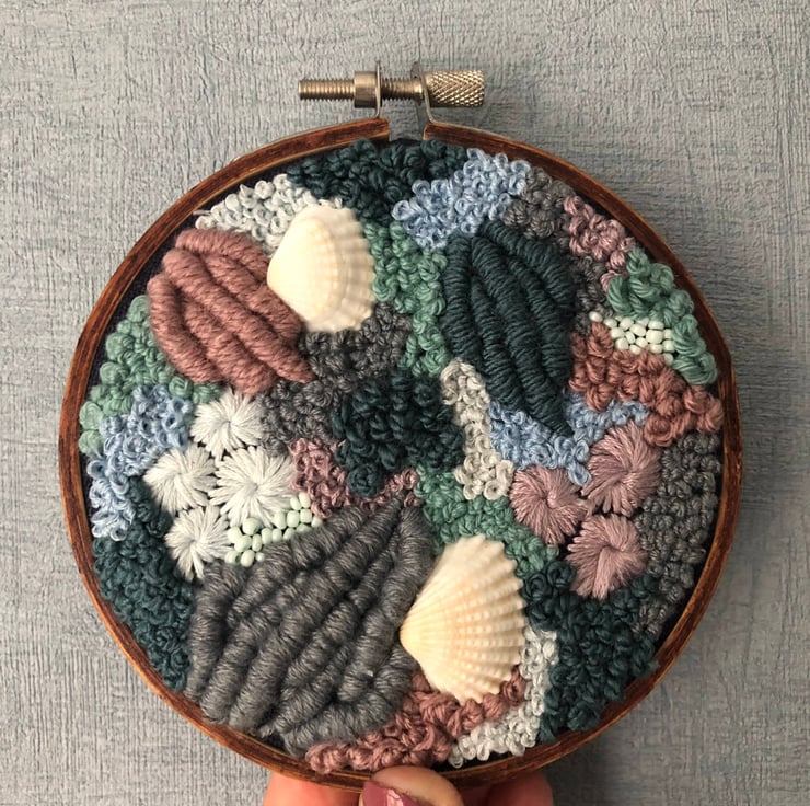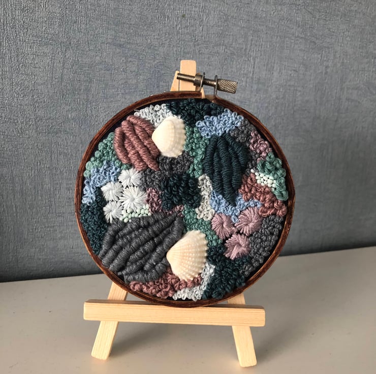 Mauve midnights 4 inch one of a kind hand embroidered home decor art piece. Embroidery thread and thread have been hand sewn onto a blue fabric in a abstract pattern creating a piece which is both eye catching and unique.