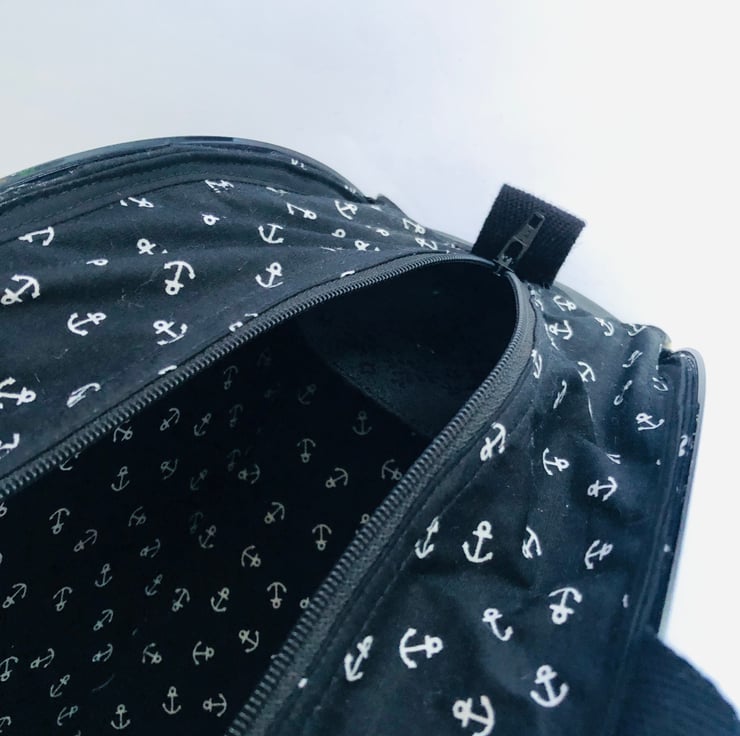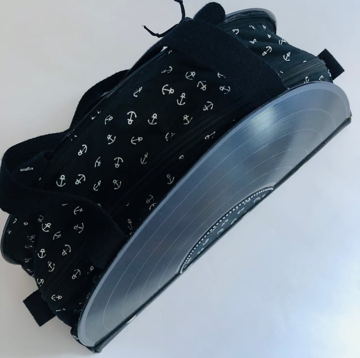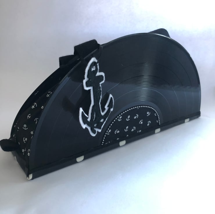 Show off your unique style with this wonderful black and white, anchor print, rockabilly style, record handbag. The base, in matt black oilcloth, is bedecked with polka dots and looks very 50s/60s. The top zip opens wide to allow easy access (and makes it easier to find things!) whilst the inside barriers stop those little bits and bobs we keep in the bottom of our bags from falling out.