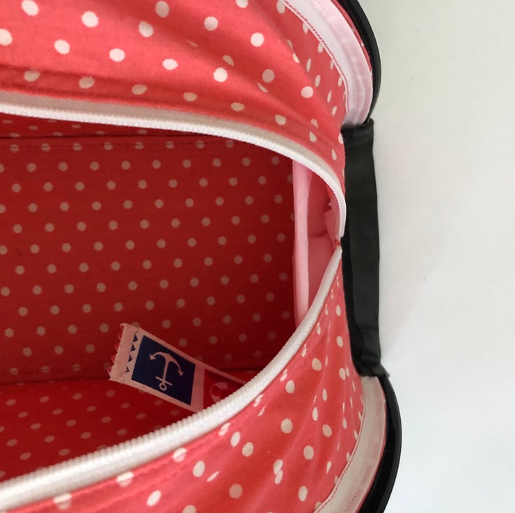A distinctive retro feel has been created by using pink polka-dot fabric for the body of the bag and matt-black polka-dot oilcloth for the base. A decoration of pink buttons, white trim and white handles complete the look.