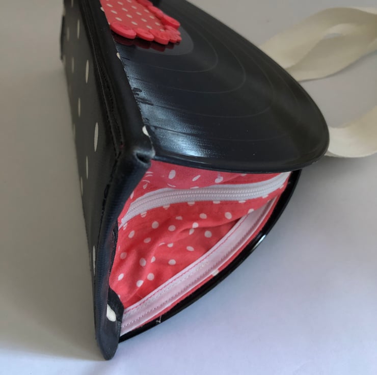 This Handbag was created using: an old, unloved L.P and new fabrics. It has been stitched together carefully using a wonderful, 1950s Singer sewing machine and the glues used for non-stitchy parts are crafter's pick, non-toxic glues. Some parts have been handstitched.
