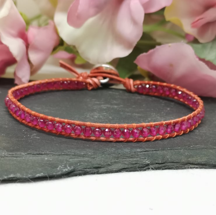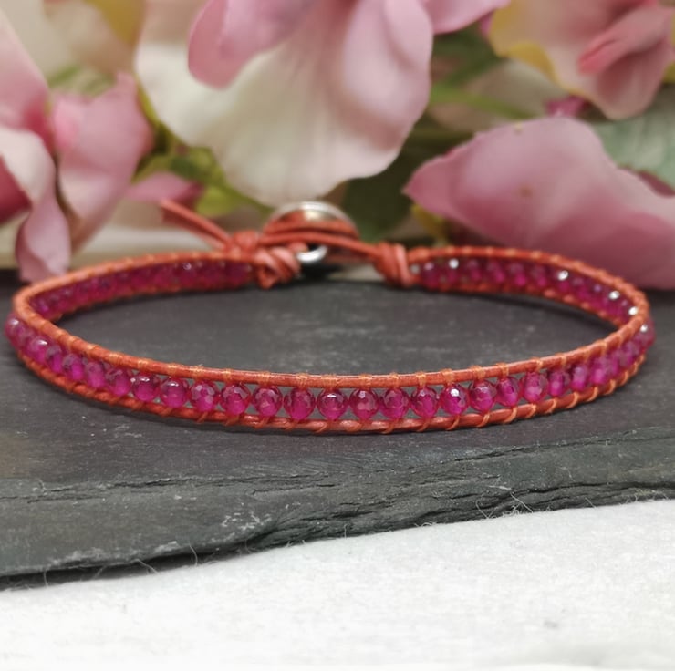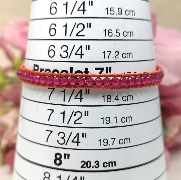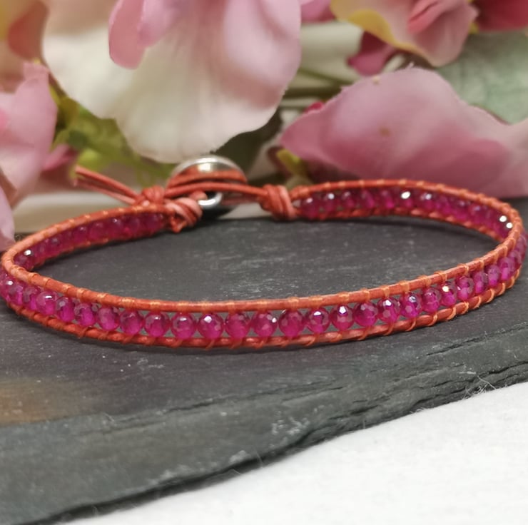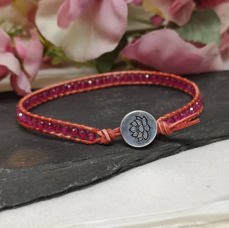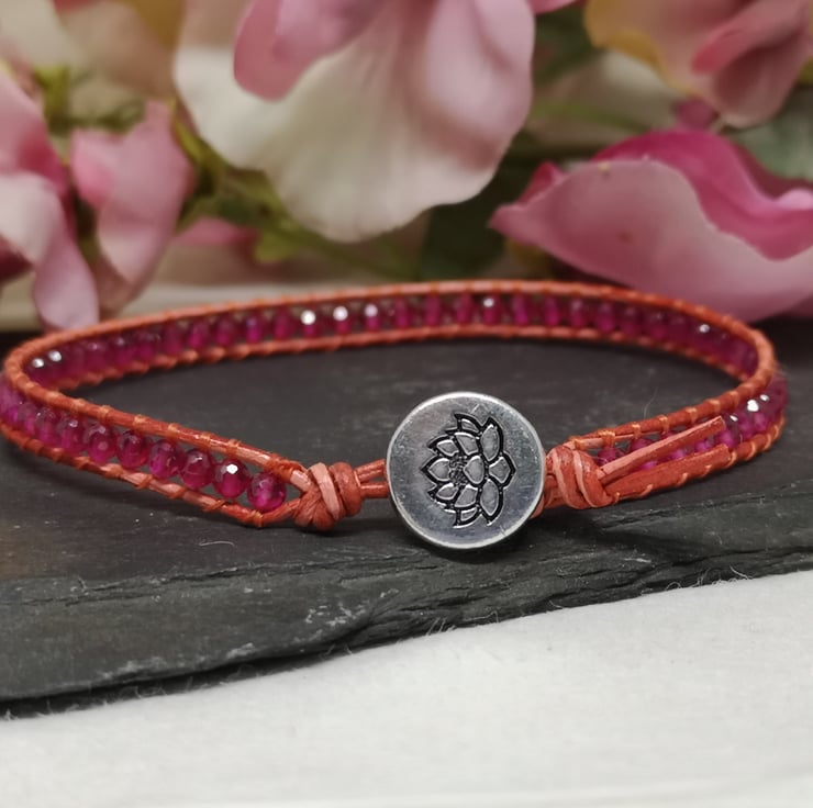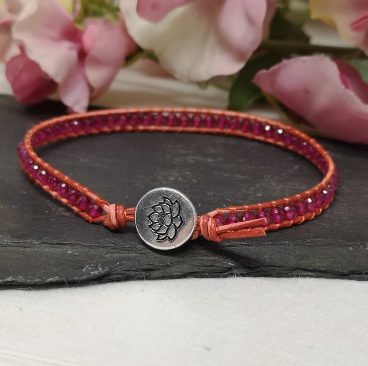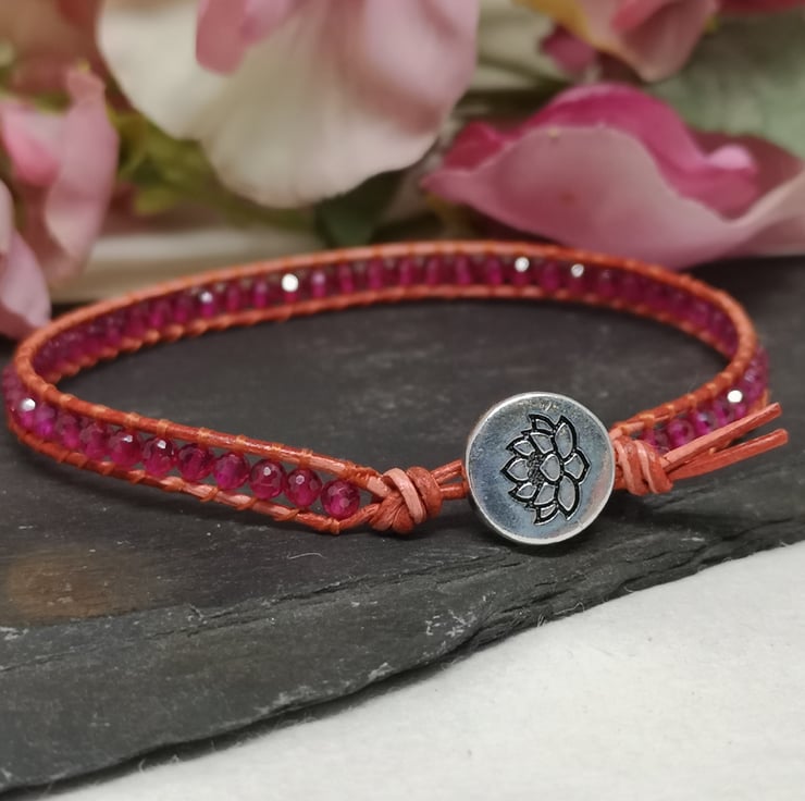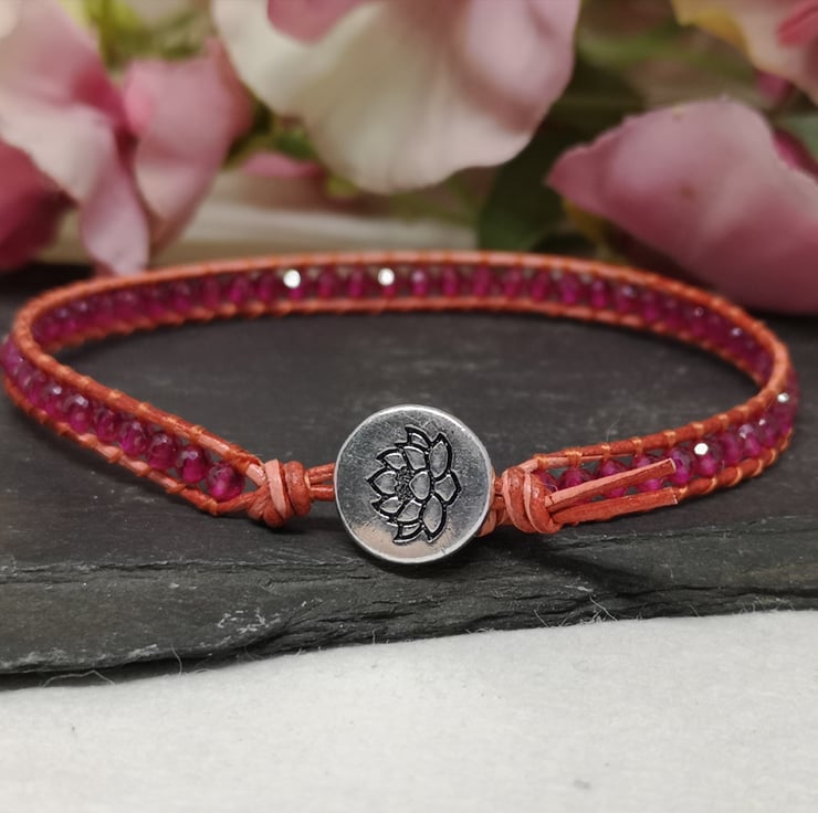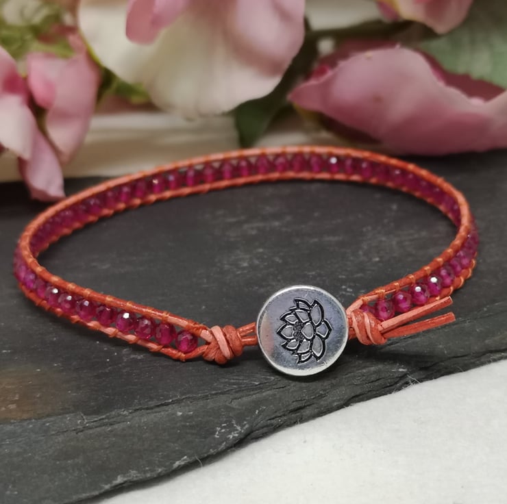 This delicate bracelet features small faceted spinel gemstone beads in a fabulous shade of pink. I've colour-clashed them with orange-red leather cord with a small silver coloured button with a lotus flower decoration.