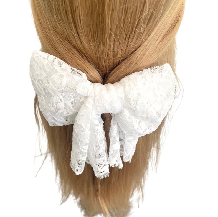 Make a statement on your wedding day with our White Luxury Lace Bridal Hair Bow. Each piece is carefully handcrafted to ensure a one-of-a-kind creation for your once-in-a-lifetime moment. Elevate your bridal ensemble and let this exquisite accessory be the finishing touch that completes your dream wedding look!