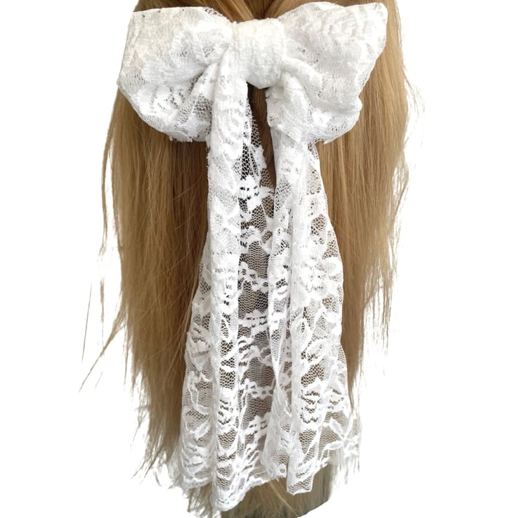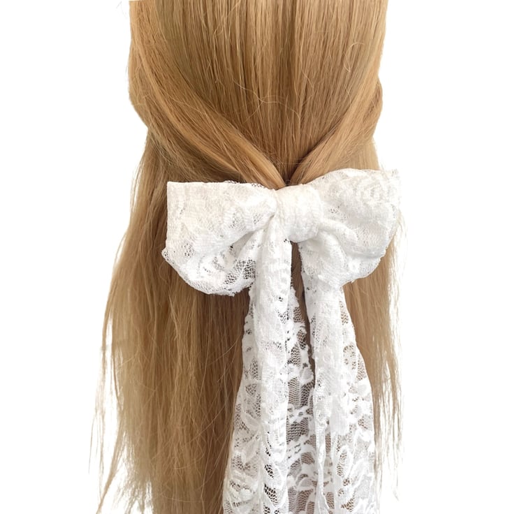 Make a statement on your wedding day with our White Luxury Lace Bridal Hair Bow. Each piece is carefully handcrafted to ensure a one-of-a-kind creation for your once-in-a-lifetime moment. Elevate your bridal ensemble and let this exquisite accessory be the finishing touch that completes your dream wedding look!