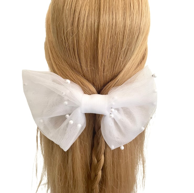 Make a statement on your wedding day with our White Luxury Tulle Bridal Hair Bow. Each piece is carefully handcrafted to ensure a one-of-a-kind creation for your once-in-a-lifetime moment. Elevate your bridal ensemble and let this exquisite accessory be the finishing touch that completes your dream wedding look!
