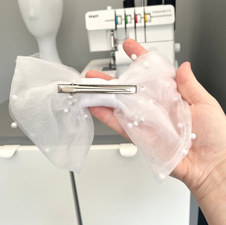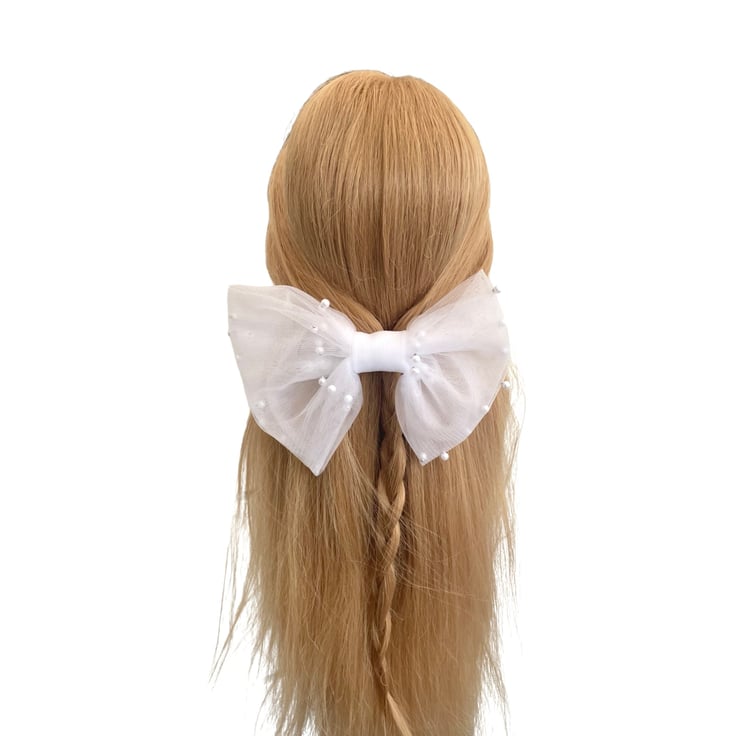 Versatile and easy to wear, our bridal pearl tulle hair bow complements a variety of hairstyles, whether you choose an updo, loose waves, or a classic bun. It securely fastens to your hair, allowing you to dance the night away without worrying about readjustments.