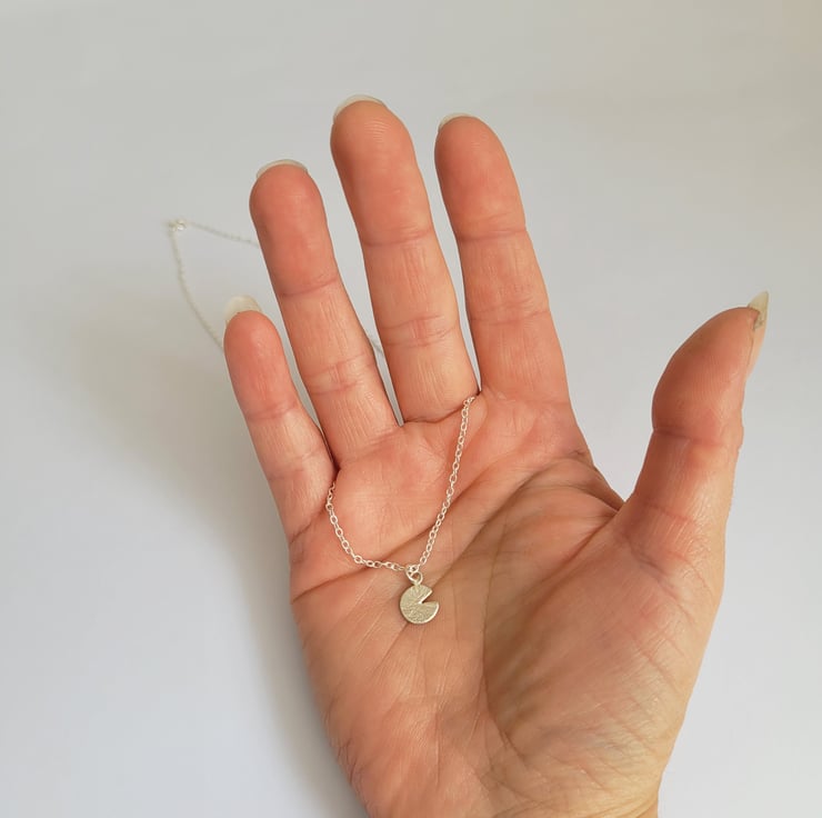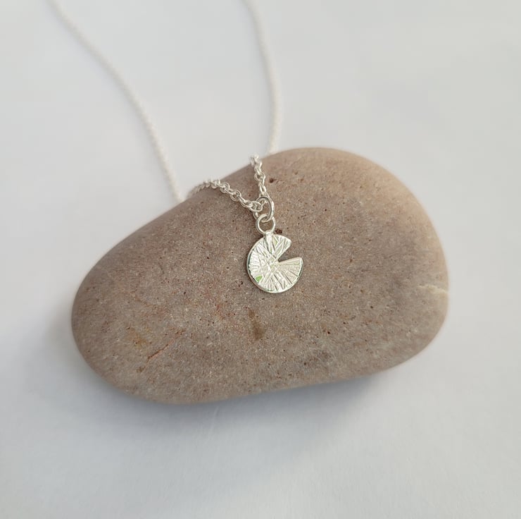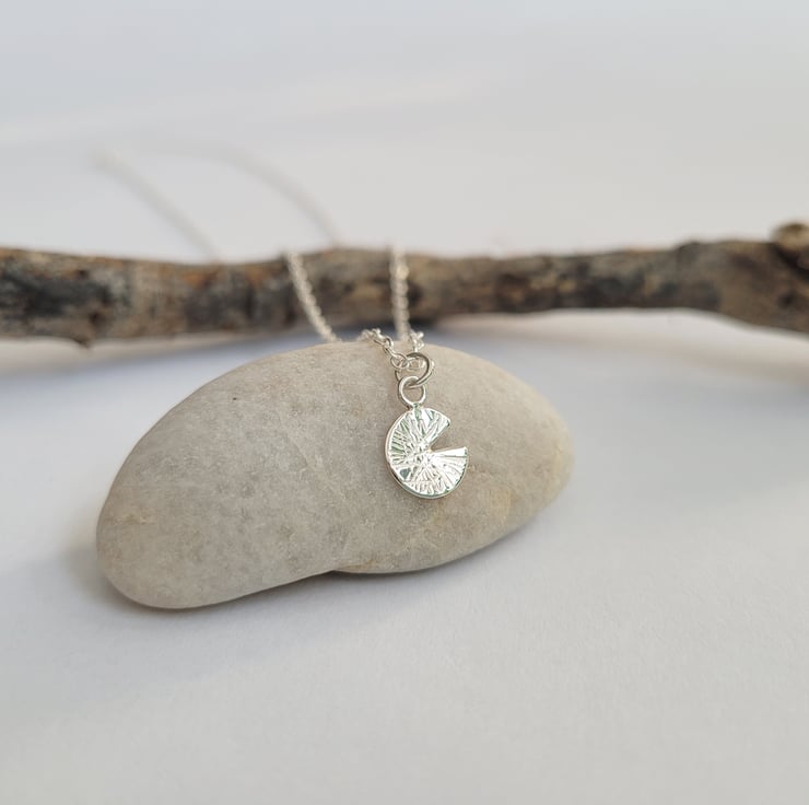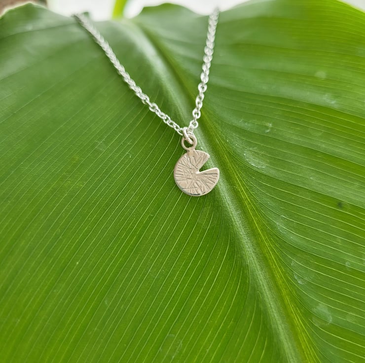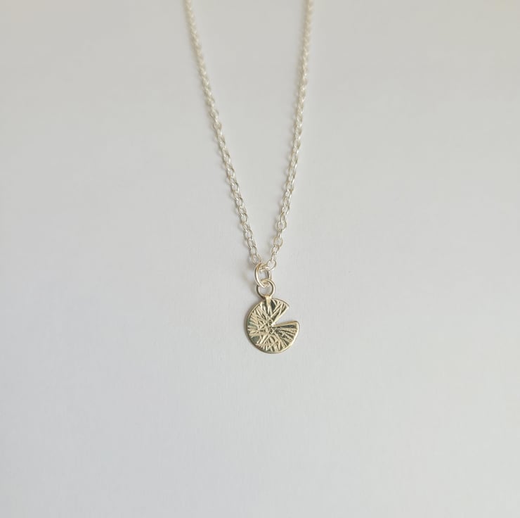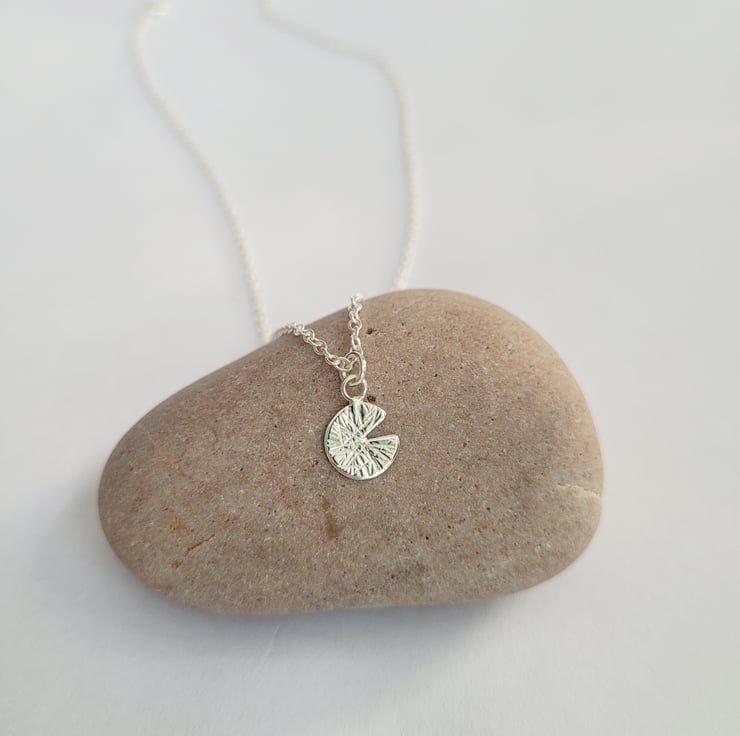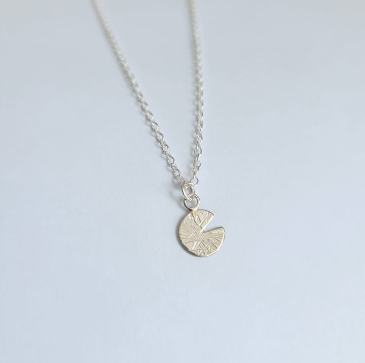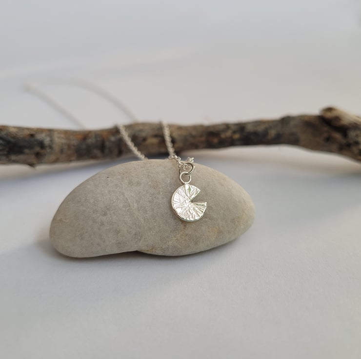 A sheet of recycled sterling silver has been given an abstract line texture and cut into the shape of a water lily pad. The pendant necklace is attached to a sterling silver chain.