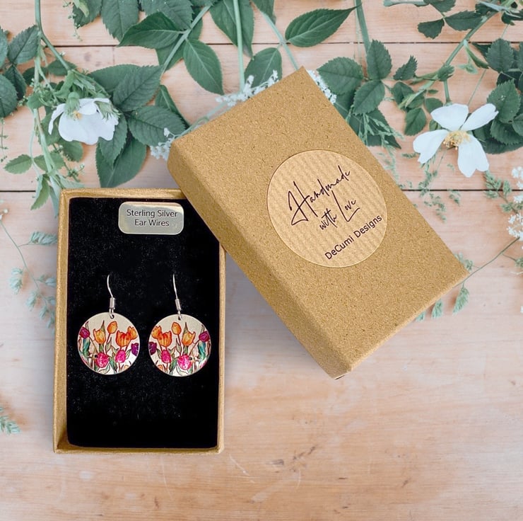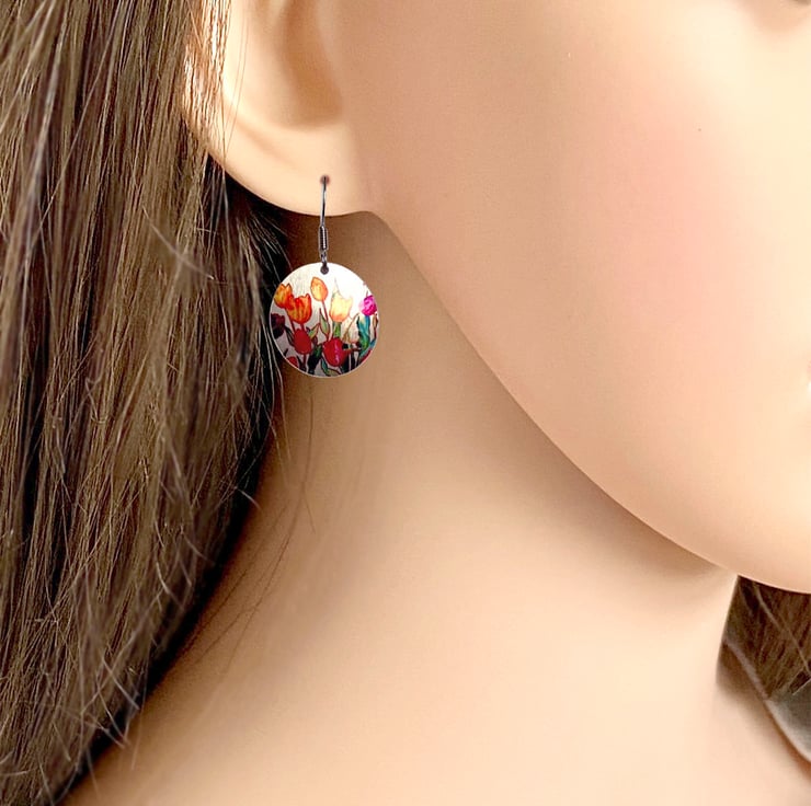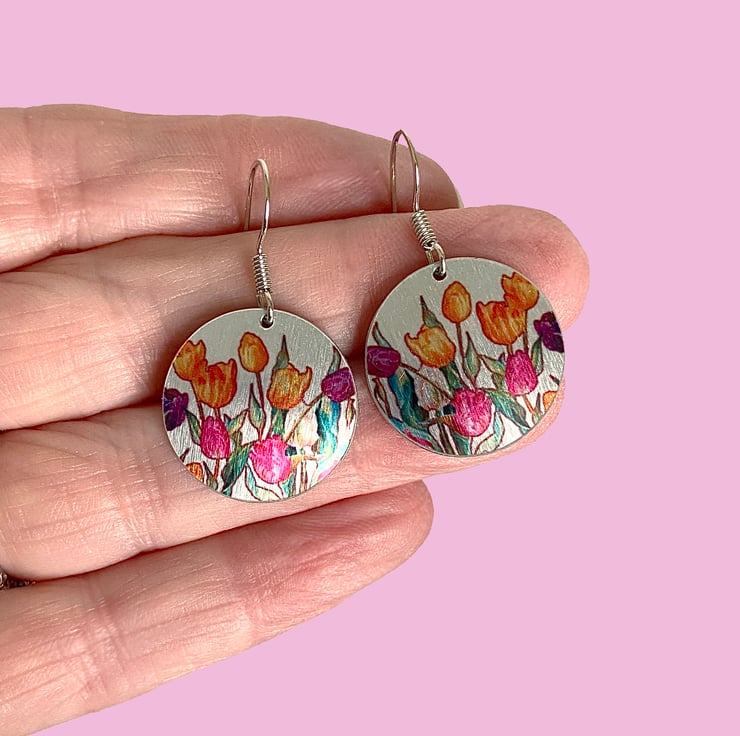 I have handmade the discs and artwork for these earrings, and the drops have a pretty, pink, purple and orange tulip flower design, An ideal gift for nature lovers. A matching bracelet is available.