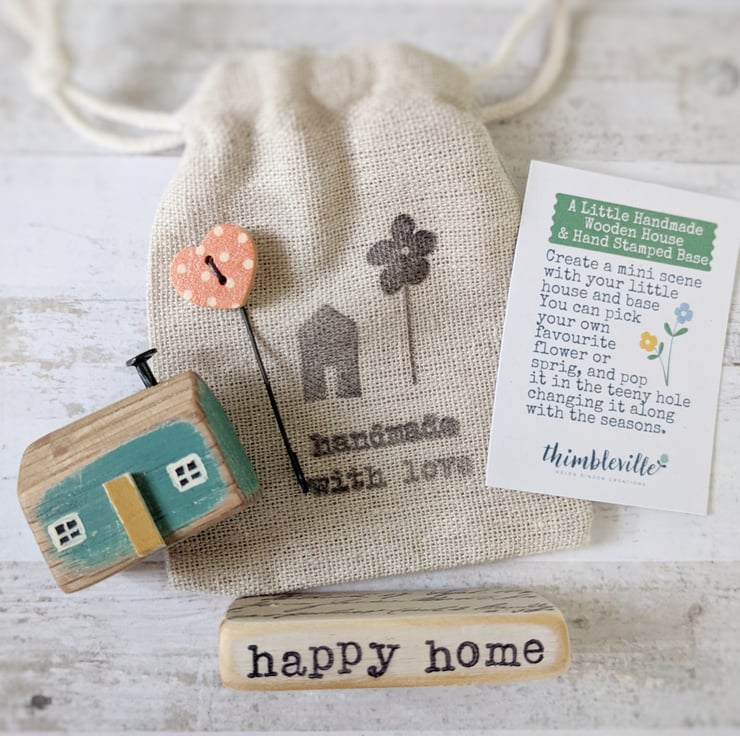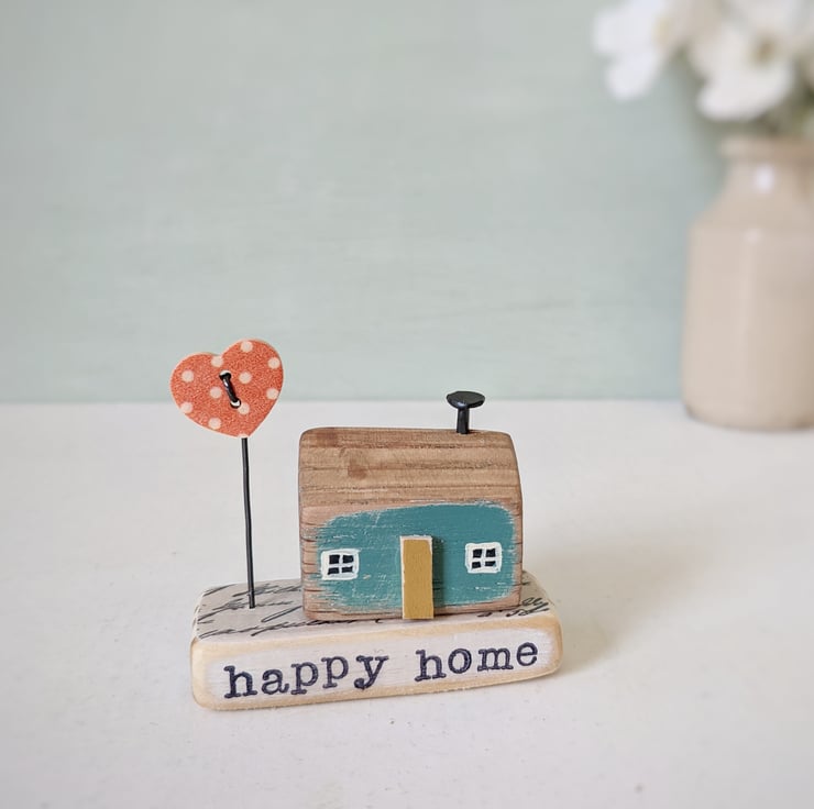 A hand stamped wooden base with a teeny painted house and a jolly heart on a wire to stand beside it.