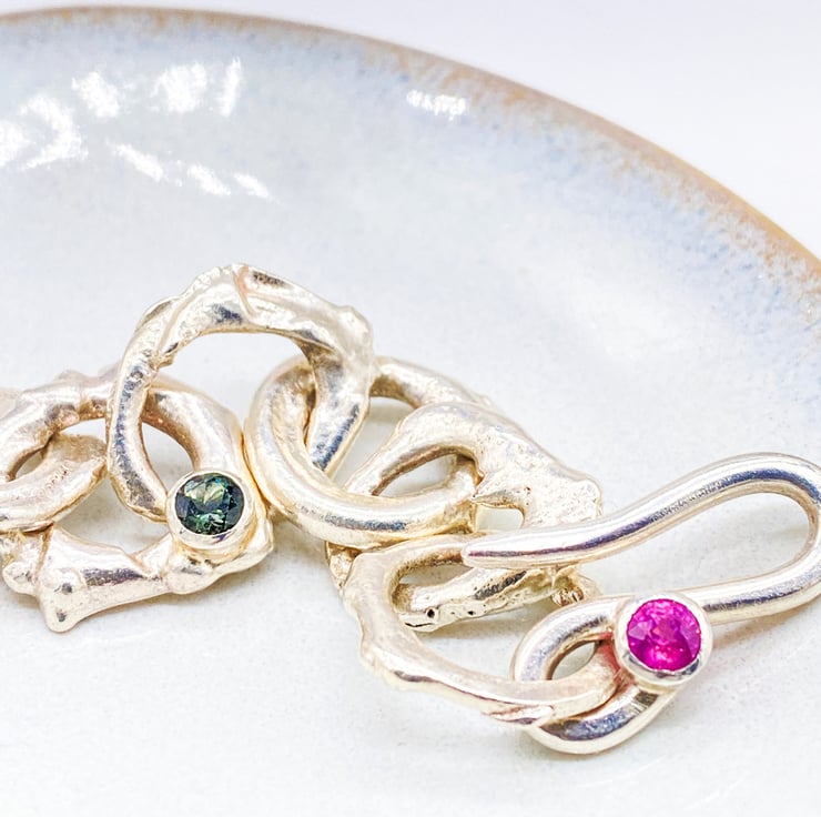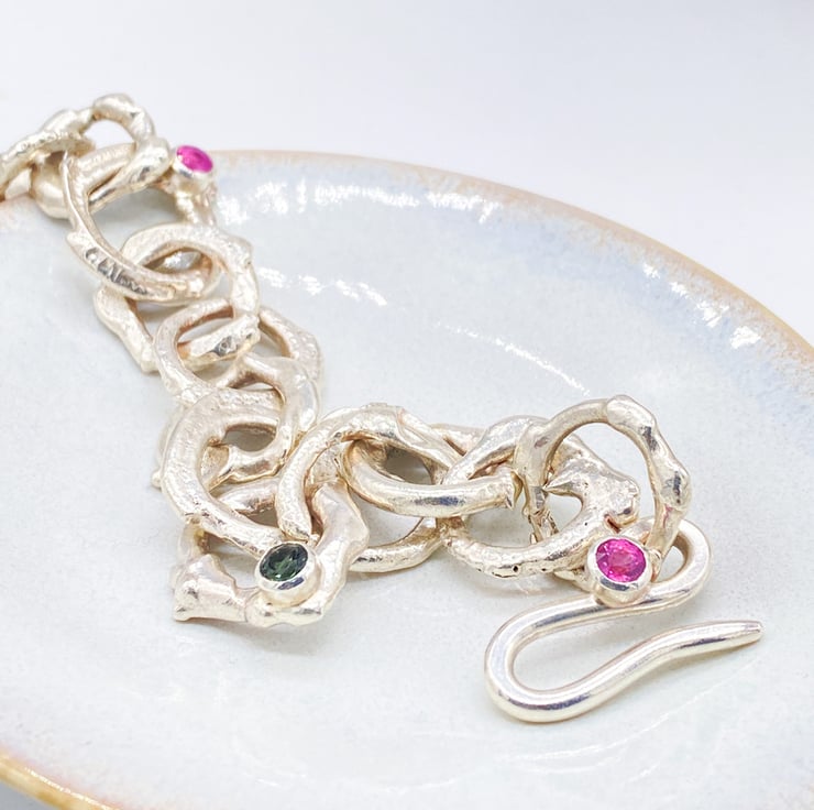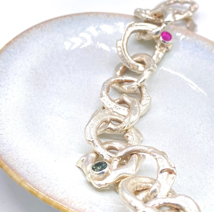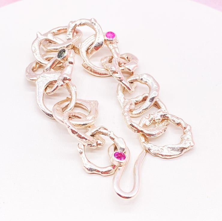 OOAK molten sterling silver chunky bracelet with pink sapphire and green tourmaline, with a handmade fastener that has a pink sapphire on. It's made using recycled sterling silver. Each piece of the bracelet is is individually made using casting method.