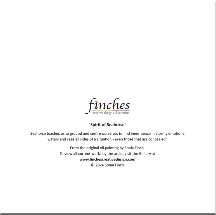 A beautiful blank greeting card created from the oil painting 'Spirit of Seahorse'. The totem spirit message on the reverse is: