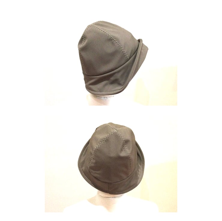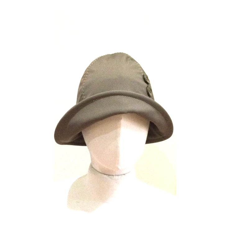 Asymetric cloche style rain hat can be worn with brim turned up or down . Made from soft shell fabric which is water repellent on the outside and cosy fleece lined on the inside. Made to fit an average head-size 22.5”