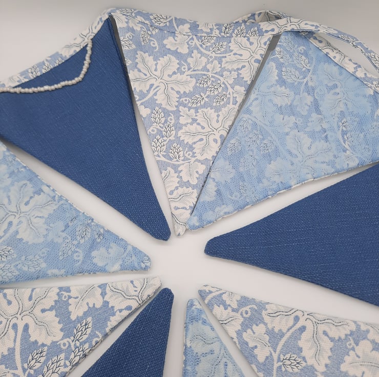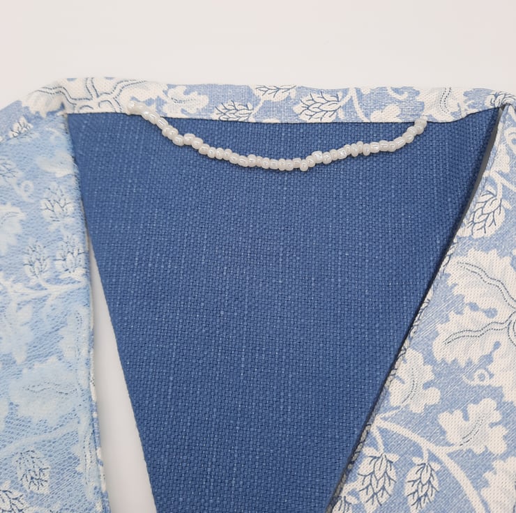 Made of 3 contrasting pendants on a pattern repeat. The main fabric is a quality cotton with a blue and white foliage print. 3 pendants have a gathered tulle topped. 3 are a plain weave blue cotton with pearl beaded cord detail.