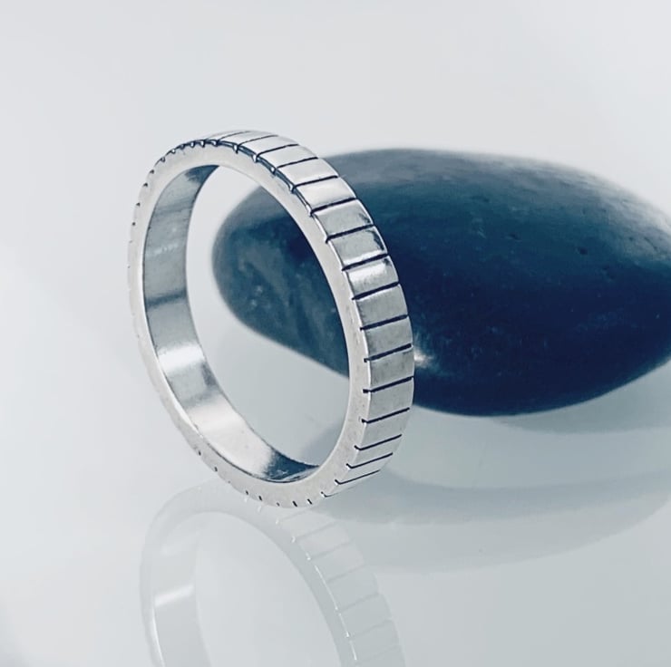 Minimalistic design, polished silver band and linear lines applied.
