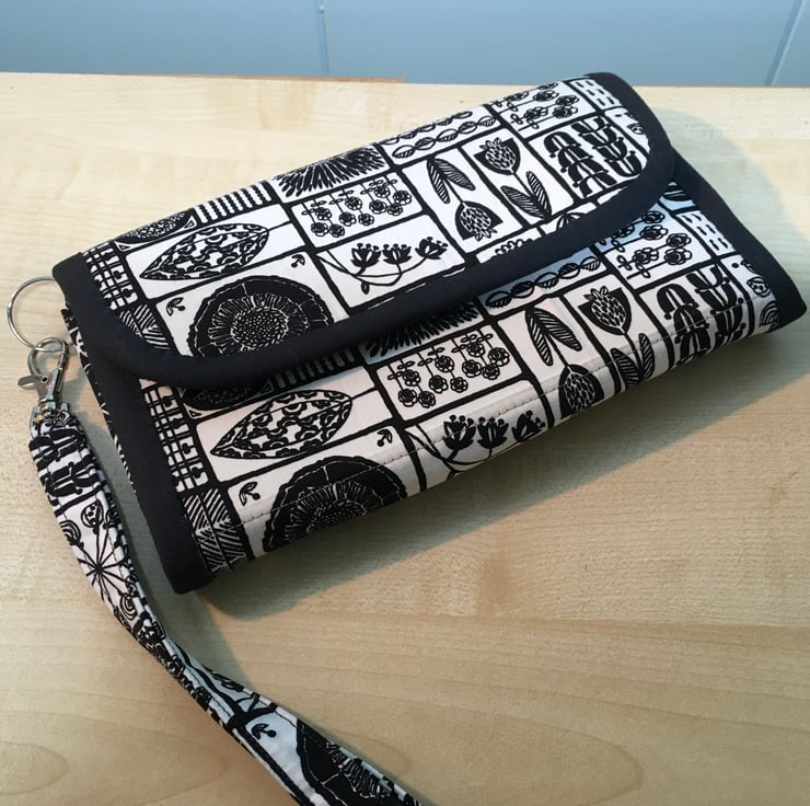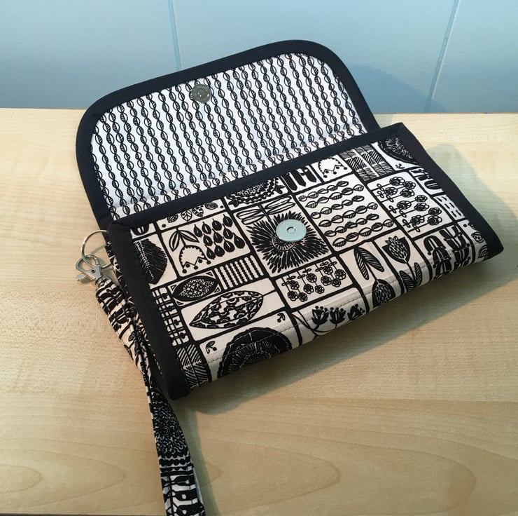 The black and off-white fabric has stylised flora and geometric lines and is finished with black binding.