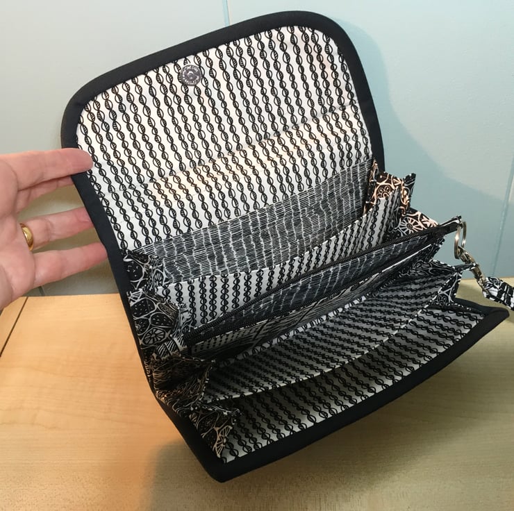 I made it with 5 slip compartments, 1 zipped pocket and lots of slots for cards. It measures 8 1/2” wide, 4 1/2” high, has a 1” deep base and closes with a magnetic fastener.