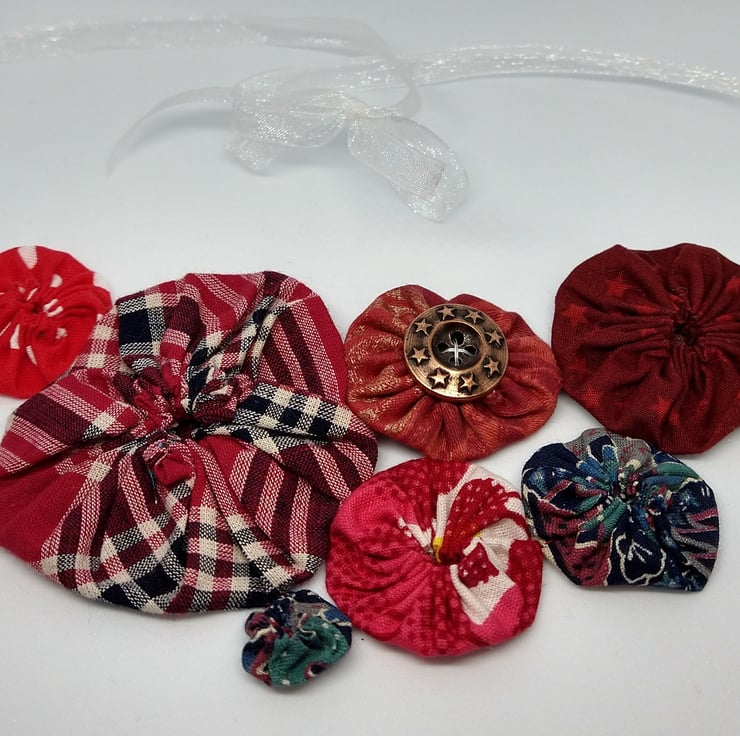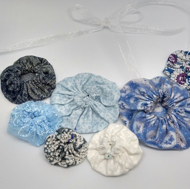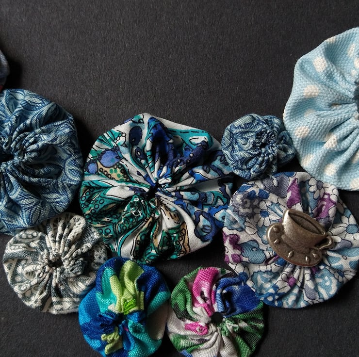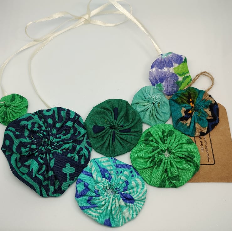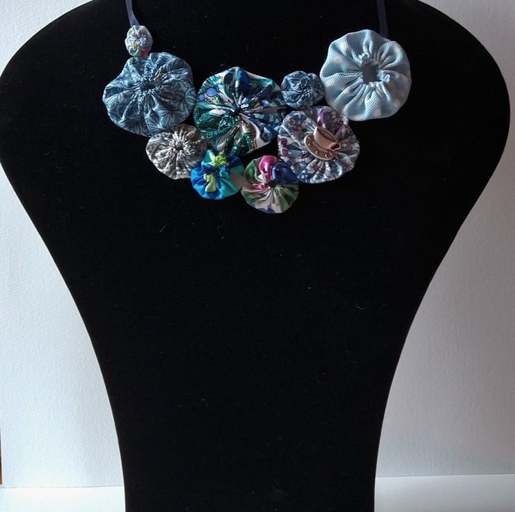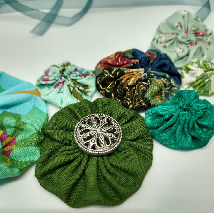 Suffolk Puffs are an old form of patchwork worked from circles of cloth. I think they're a great way of combining colours and prints and making use of smaller pieces of fabric. My statement Suffolk Puff necklaces are light and easy to wear, they tie with ribbon so you can adjust the length to suit your style and outfit. I love choosing which colours and prints to put together and sometimes add the odd button too for a bit of extra embellishment.