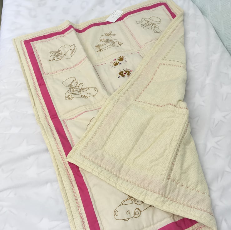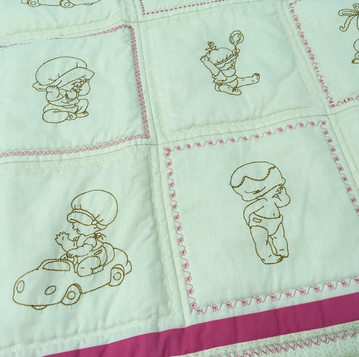 The over-sized bonnets and the antics the baby is getting up to are so cute with lots to look at as the child grows up. I finished the quilt with lots of decorative stitching in Ivory and girly Pink round each block, a bright pink border and cream binding to match the backing.
