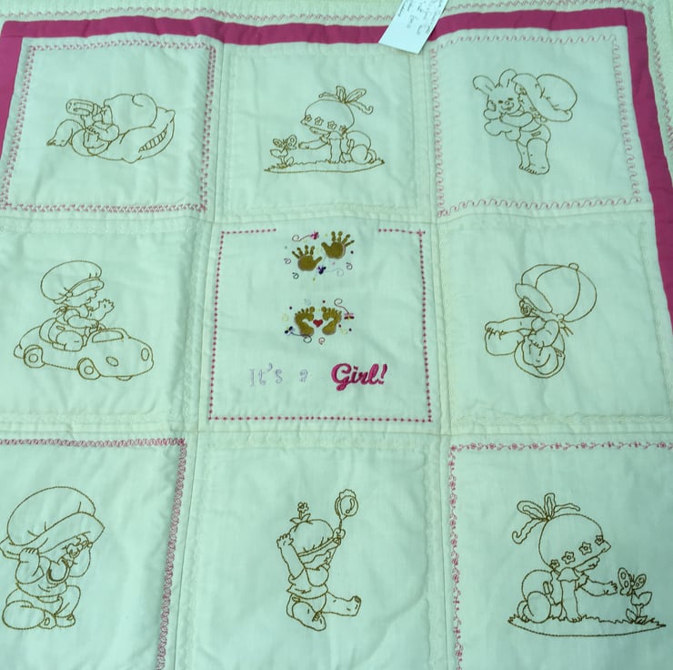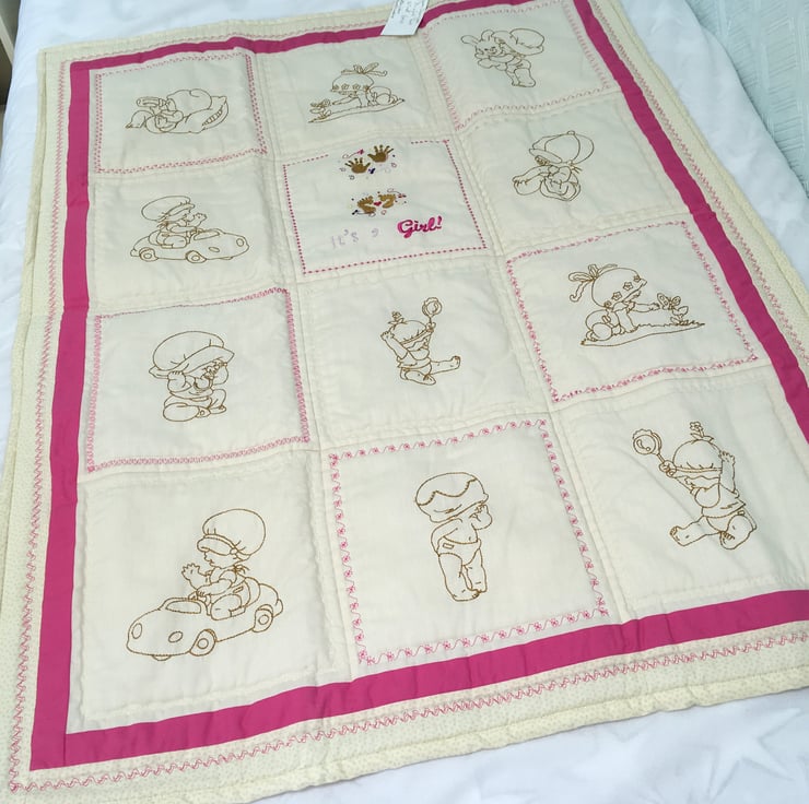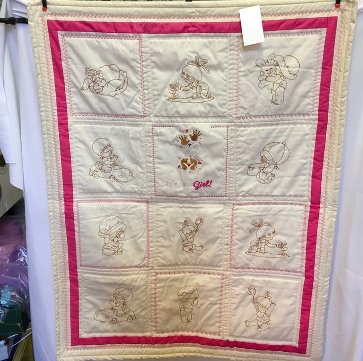 With the adorable stitched pictures of baby girls in bonnets and the main block stating ‘ It’s A Girl,’ with the feet and hand prints, this quilt would be a perfect gift to celebrate a new baby.