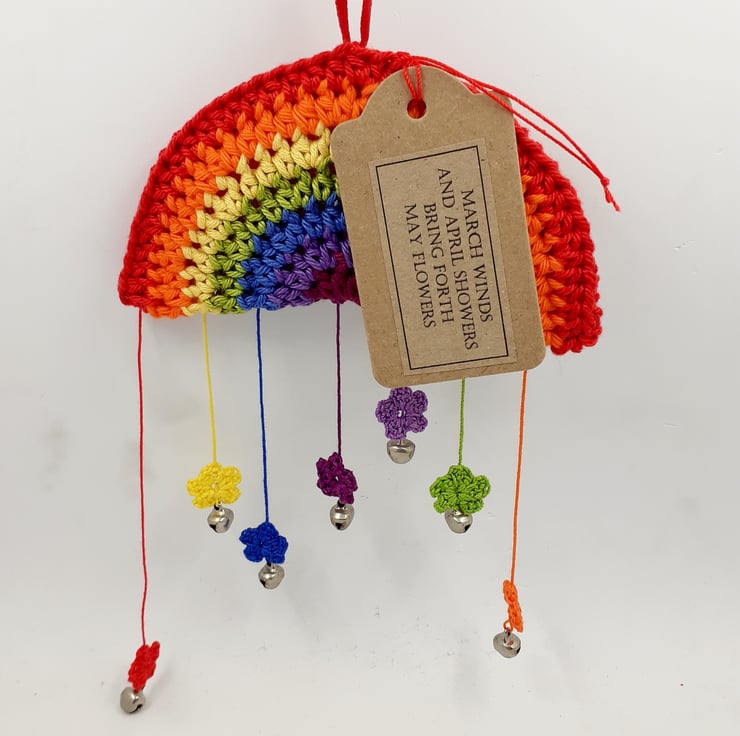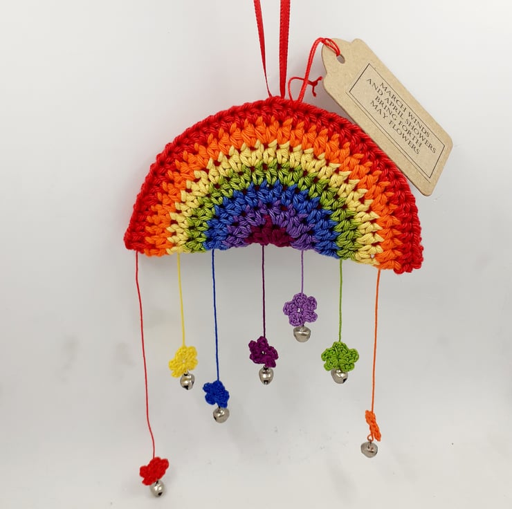 The tag has lines from the traditional English rhyme, 'March winds and April showers bring forth May flowers.' There is a narrow ribbon hanging loop. The rainbow measures approximately 10 cm wide and the whole decoration measures approximately 24 cm from the top of the hanging loop to the bottom of the violet flower. It comes wrapped in tissue in a labelled PIP (Postage in Proportion) box, all ready to be given or posted on.