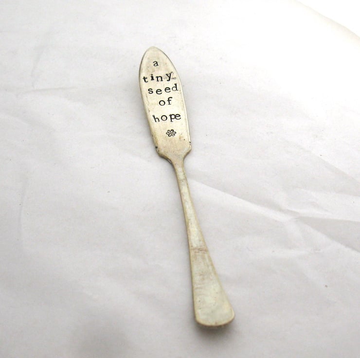 A vintage silverplated butter spreader, upcycled into a little plant pot marker by the addition of the handstamped wording 'a tiny seed of hope' and a little hand stamped flower. Just perfect for a tiny plant pot where something special and delicate is germinating...
