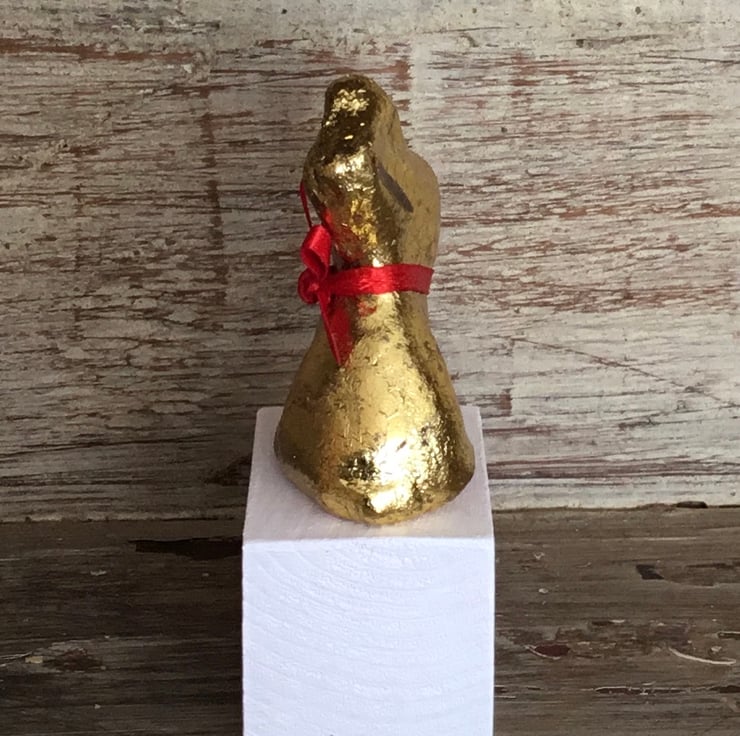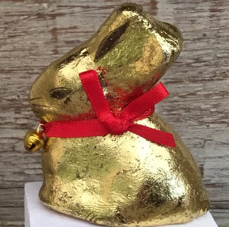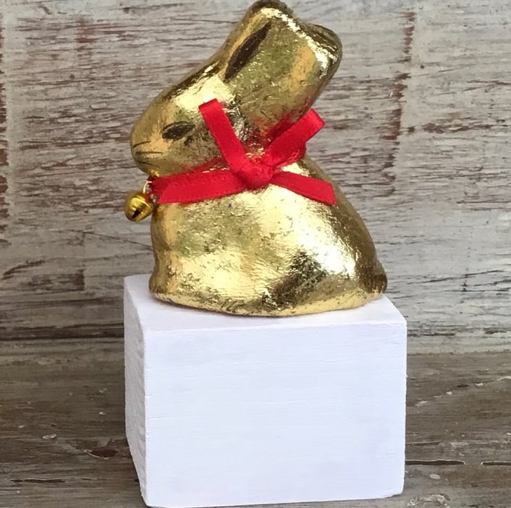 Cute handmade pottery Lindt bunny ornament mounted on a white washed wooden block. Measures approx 3.5 inches high.